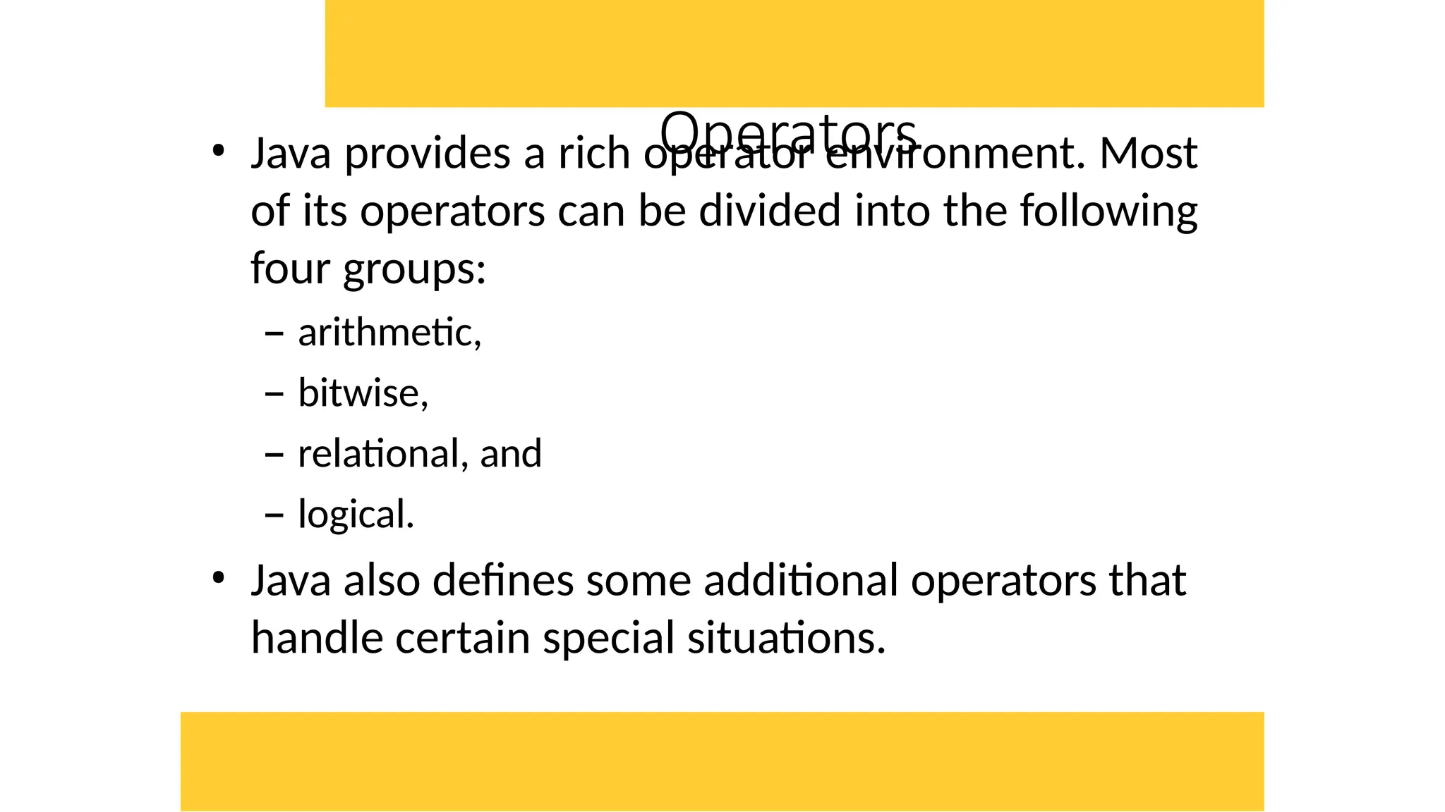 The document provides an overview of Java operators, categorizing them into arithmetic, bitwise, relational, and logical operators. It explains their functionalities with examples, including the use of increment/decrement, bitwise operations, shift operators, and the ternary operator. Additionally, it highlights the concept of short-circuit logical operators and assignment operations in Java.