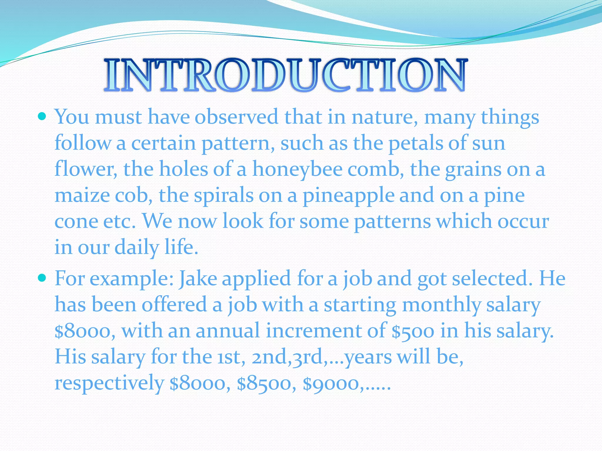 The document discusses arithmetic progressions (AP), which are lists of numbers where each subsequent term is calculated by adding a fixed number (the common difference) to the previous term. It provides examples of APs and explains how to determine if a list is an AP based on having a common difference between terms. The key characteristics of an AP include the first term, common difference, a formula for calculating the nth term, and a formula for calculating the sum of the first n terms. Examples are provided to demonstrate how to use the formulas to find the 10th term or sum of terms in a given AP.