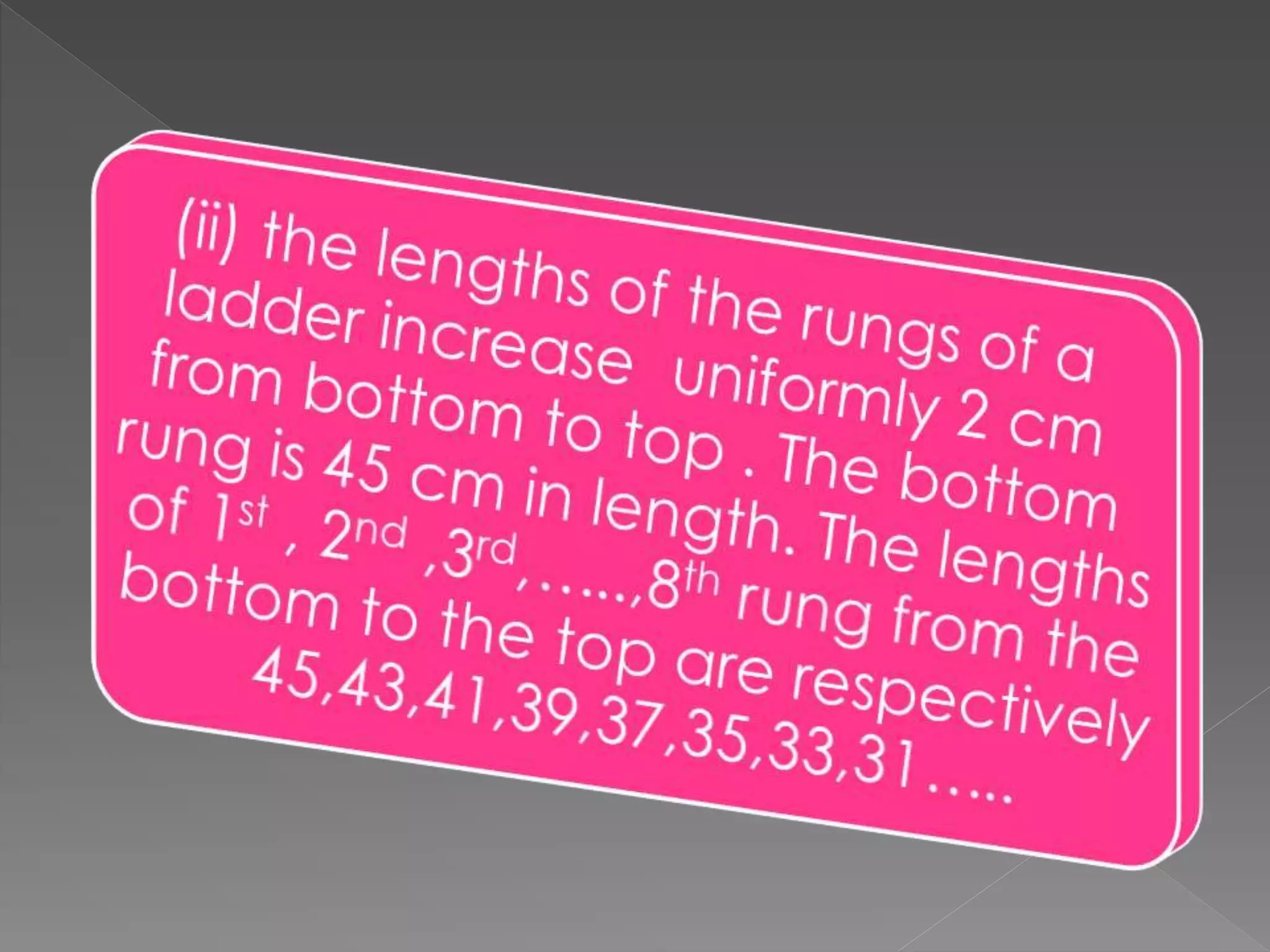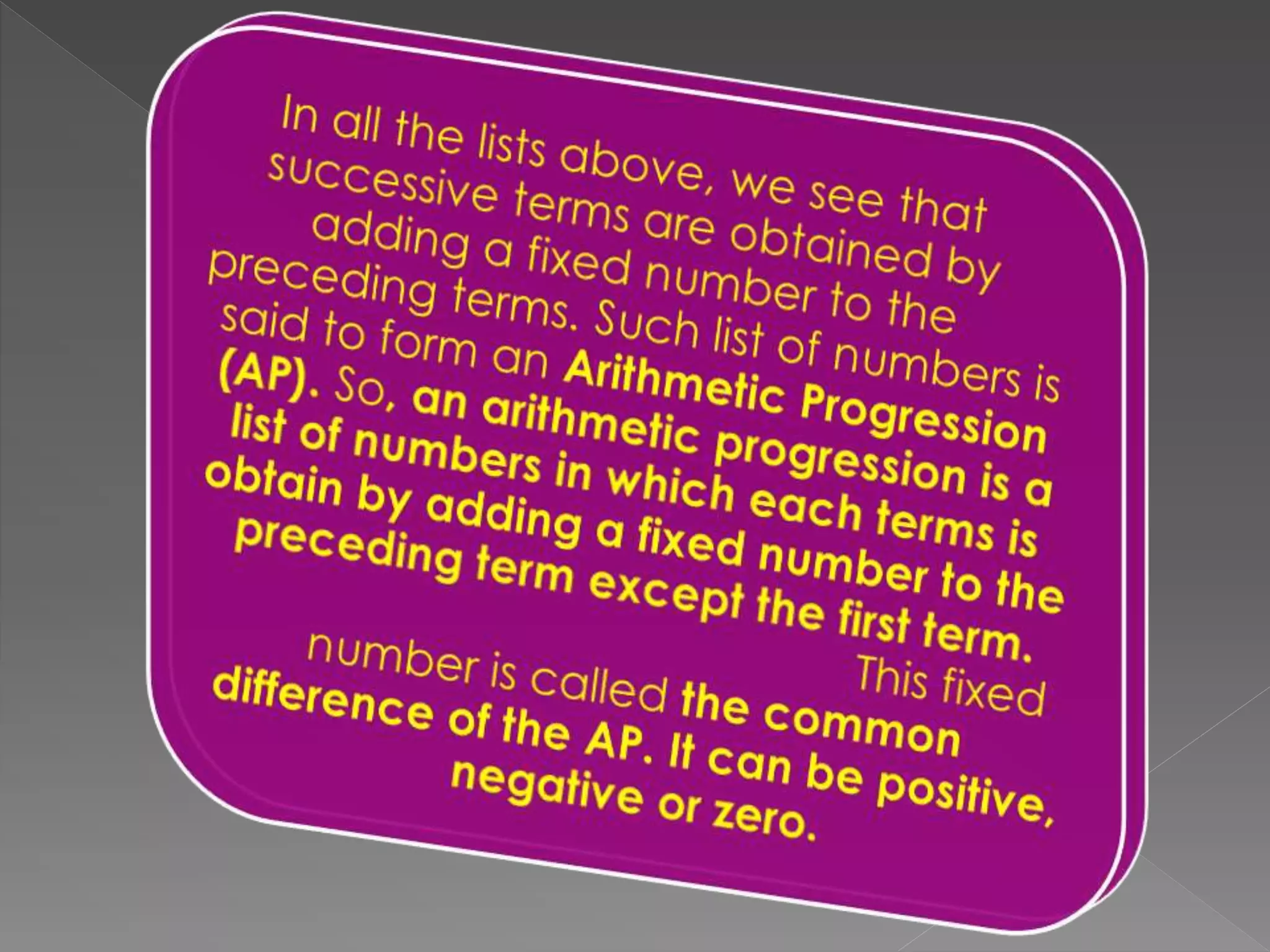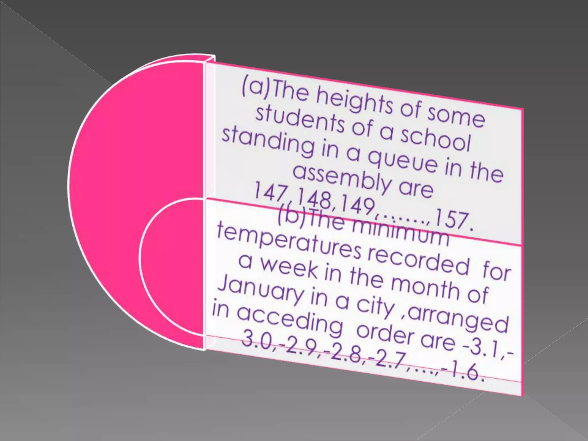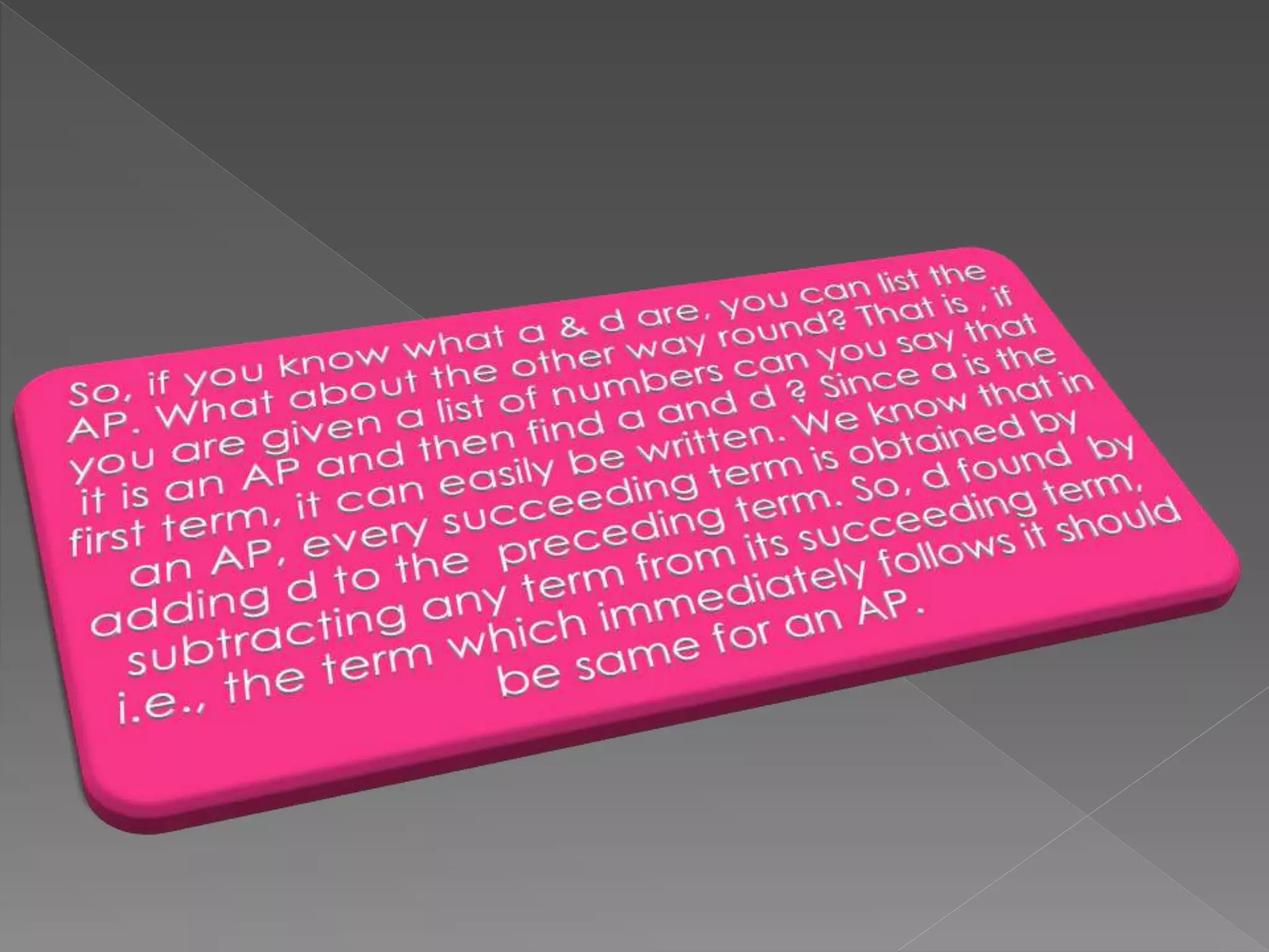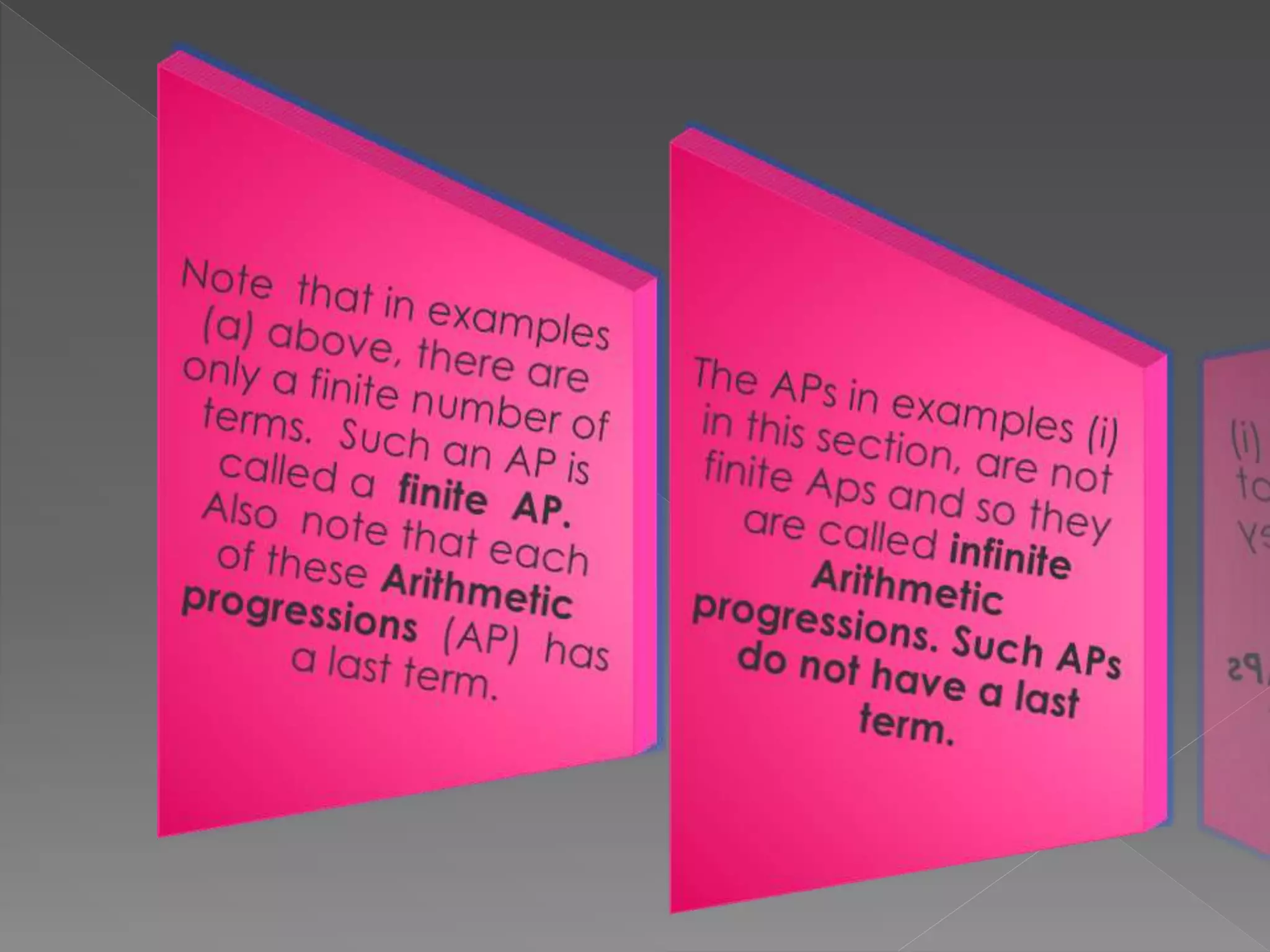 The document provides examples of arithmetic progressions and their patterns. It defines an arithmetic progression as a series of terms where the difference between consecutive terms is constant. It gives examples of arithmetic progressions with varying first terms and common differences. It also provides formulas for calculating the sum of the first n terms of an arithmetic progression based on the first term, last term, and common difference.