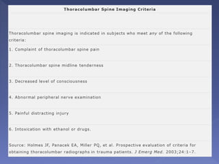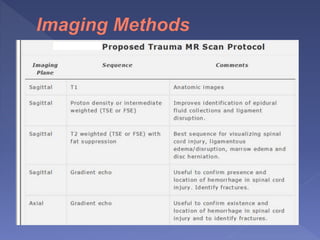 - Imaging techniques used to evaluate spinal trauma, including radiography, CT, MRI