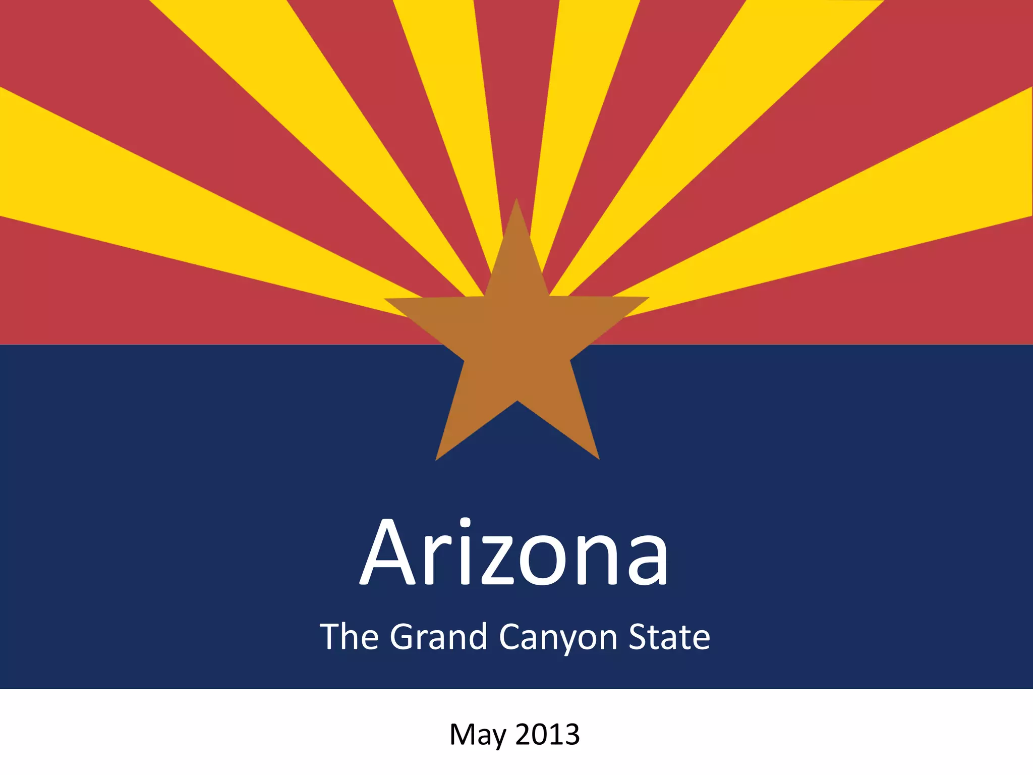 Arizona is the 6th largest state by area and has a population of over 6.6 million people. It has a diverse landscape that includes the Grand Canyon and deserts. Arizona has a long history dating back to Spanish exploration in the 16th century and became a US state in 1912. Today, its economy is centered around Phoenix and includes industries like health care, transportation, and mining. The state is home to many Native American tribes and has a variety of climates, cities, cultural attractions, and professional sports teams.