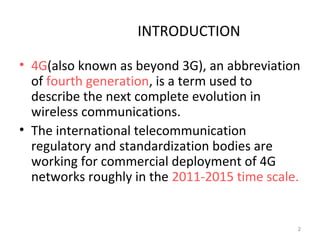 This document discusses 4G wireless networks, which will provide transmission speeds from 100Mbps to 1Gbps. 4G networks will be fully IP-based and integrated, allowing for any service from anywhere. They will require new technologies like OFDMA and MIMO to achieve the high data rates and capacity goals. 4G will also require new network components like IPv6 and advanced antenna systems to support the large number of wireless devices and provide increased network capacity and range.
