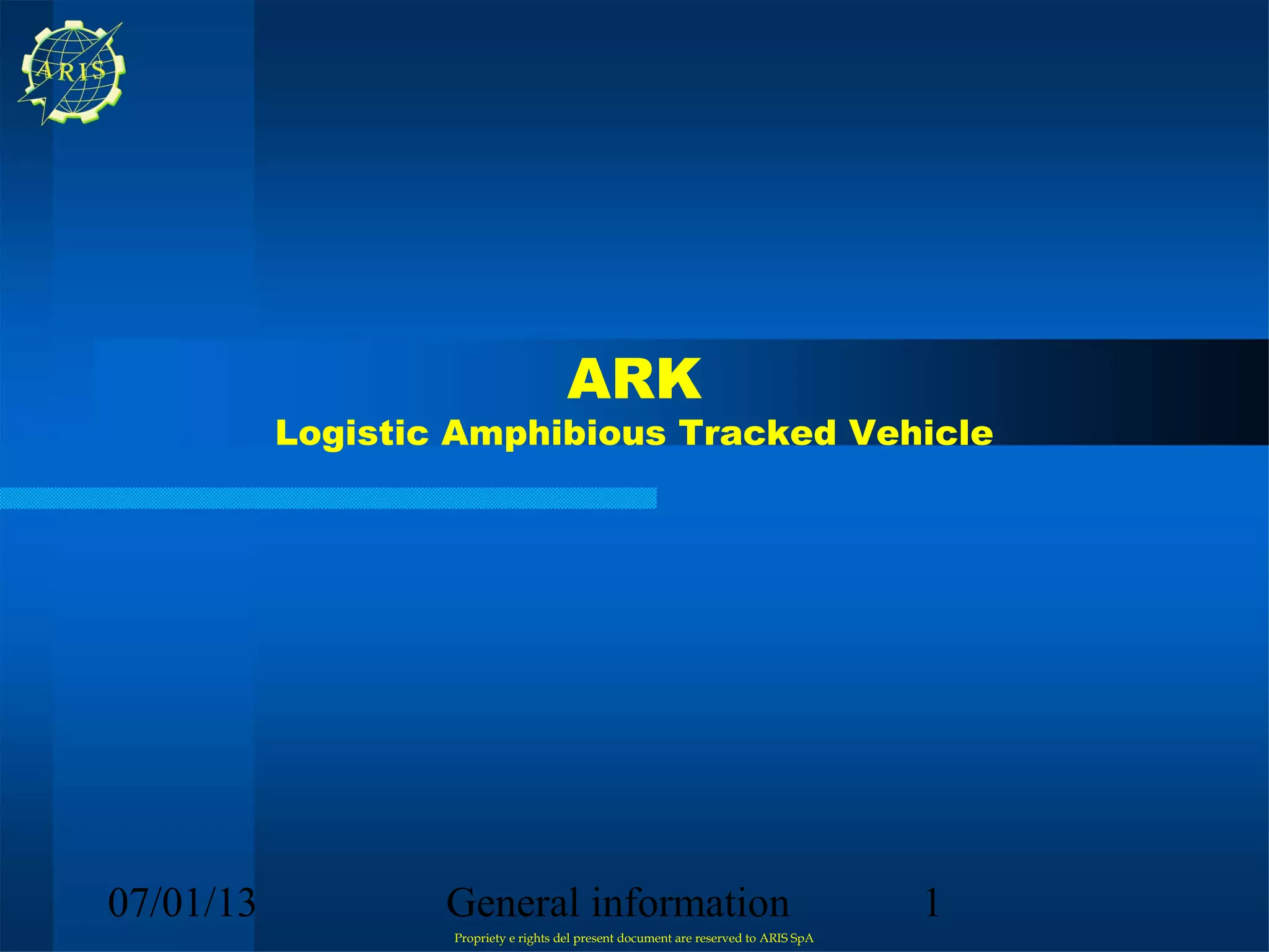 The document describes the ARK, an amphibious tracked vehicle developed by ARIS SpA to provide logistical support and emergency services. It was designed to have good navigation, stability, and loading capability in water, seas, and on land like the proven M548 vehicle it is based on. Key features include a keel for buoyancy, ducted propellers for propulsion, and the ability to operate as an ambulance, carry supplies, or fight fires with additional kits. The goal was to create a versatile vehicle that increases intervention and projection capabilities for civil authorities.