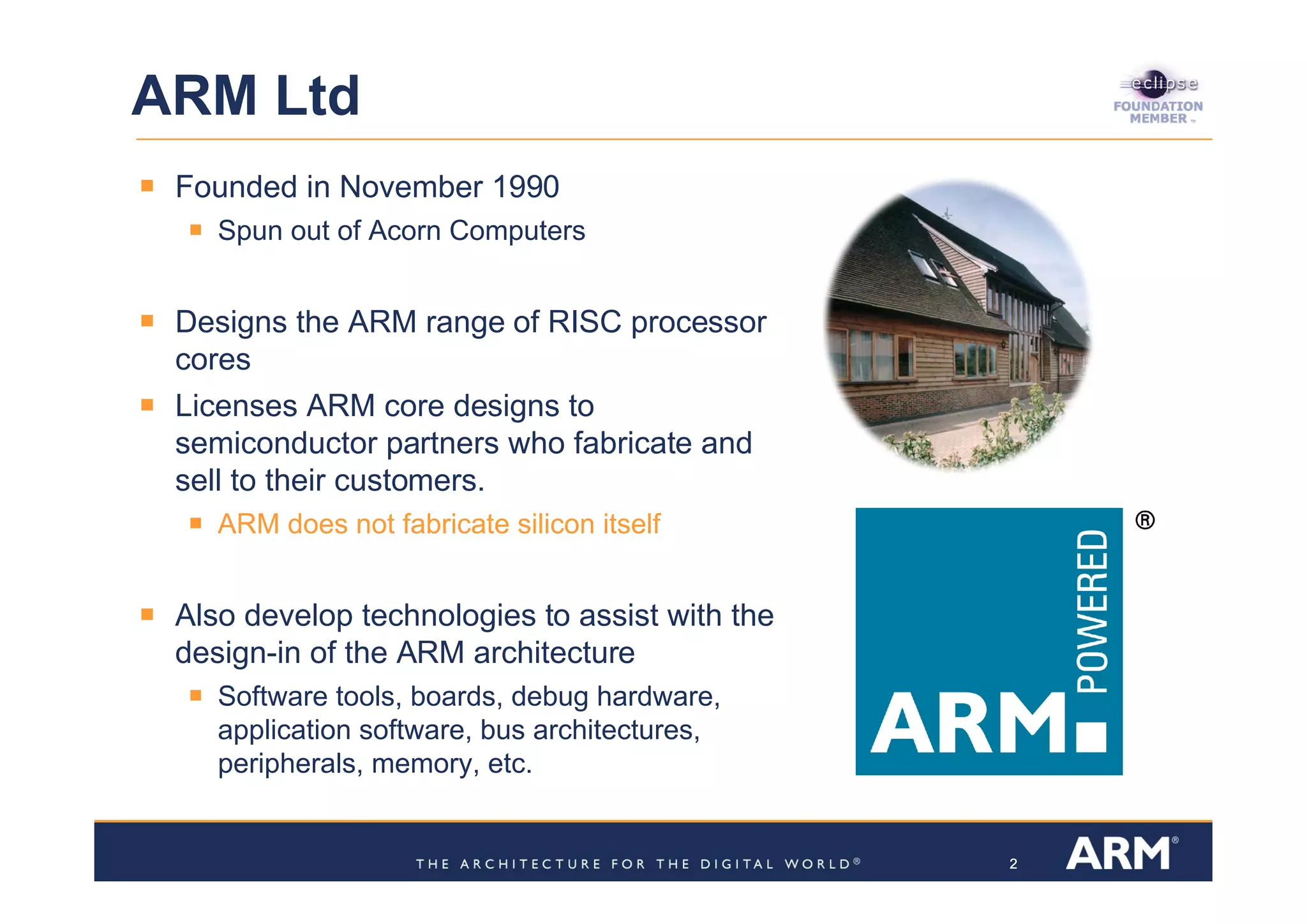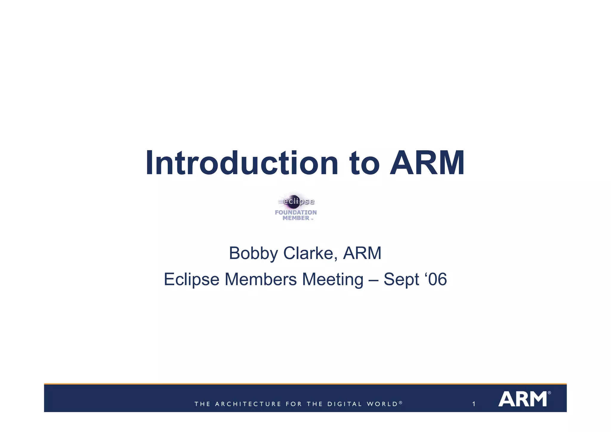 Bobby Clarke from ARM gave an introduction to ARM and their partnership model. ARM designs ARM processor cores and licenses them to partners who integrate the cores into their own chips. ARM also provides development tools and software to help with ARM architecture design and development. They are working to better integrate their tools with the Eclipse IDE through plug-ins and extensions.