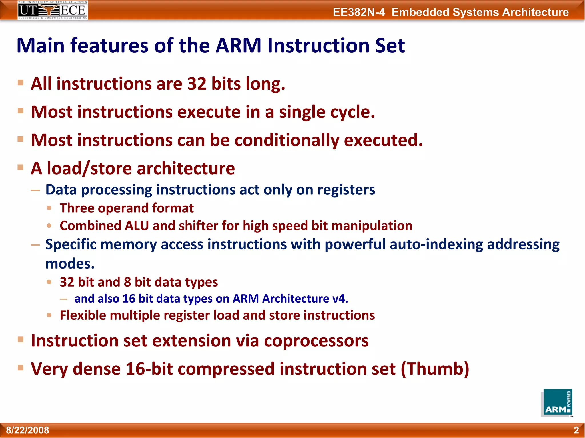 1) Instructions are 32-bits long and most execute in a single cycle. It uses a load/store architecture with separate memory access and data processing instructions.