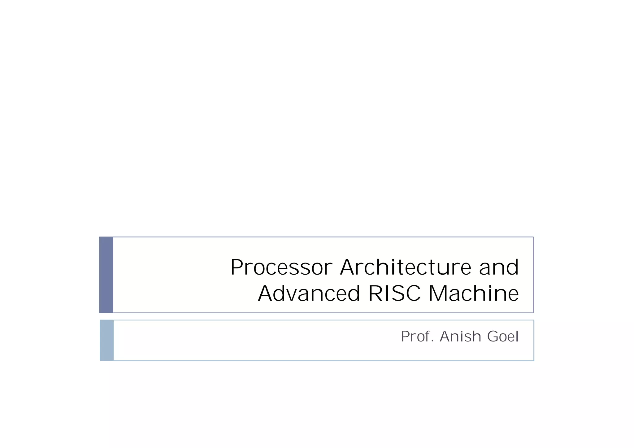This document discusses processor architecture and the ARM processor. It begins with an overview of the von Neumann and Harvard architectures. It then covers the ARM instruction set architecture, including general-purpose register architecture, CISC vs RISC designs, and techniques for exploiting instruction-level parallelism like superscalar and VLIW approaches. The document also discusses the ARM programming model, data types, instruction formats, and conditional execution.