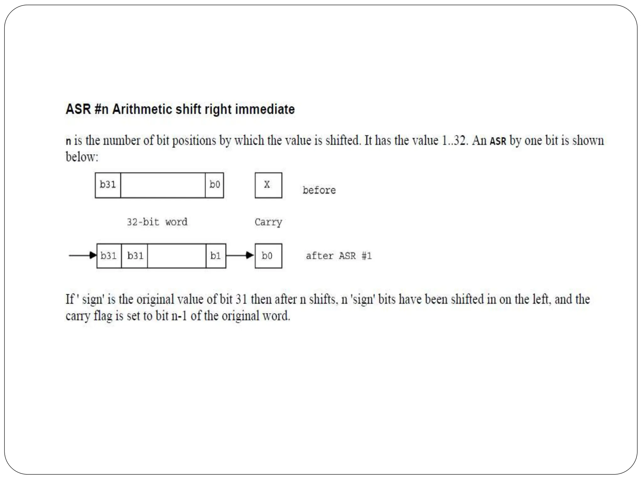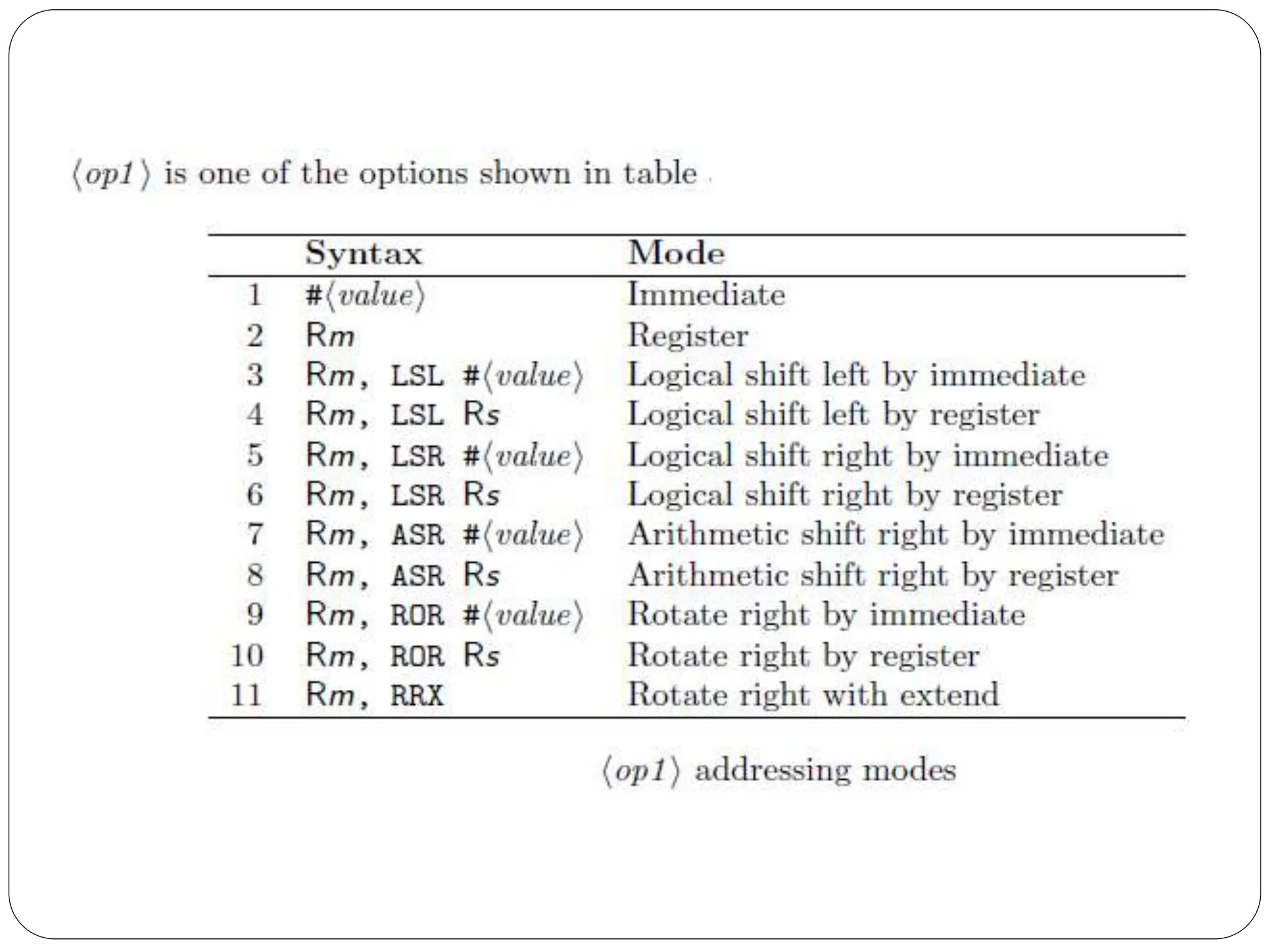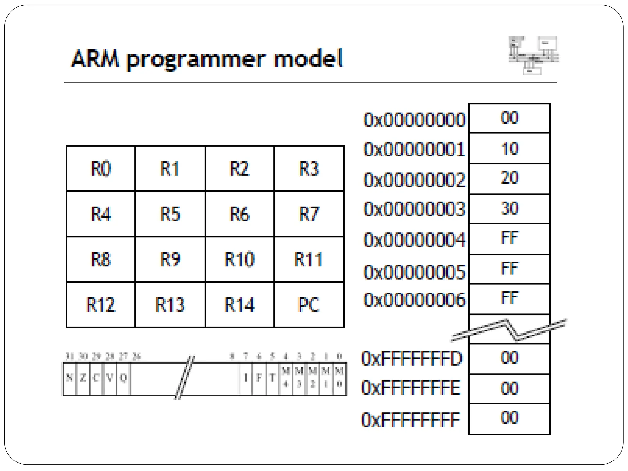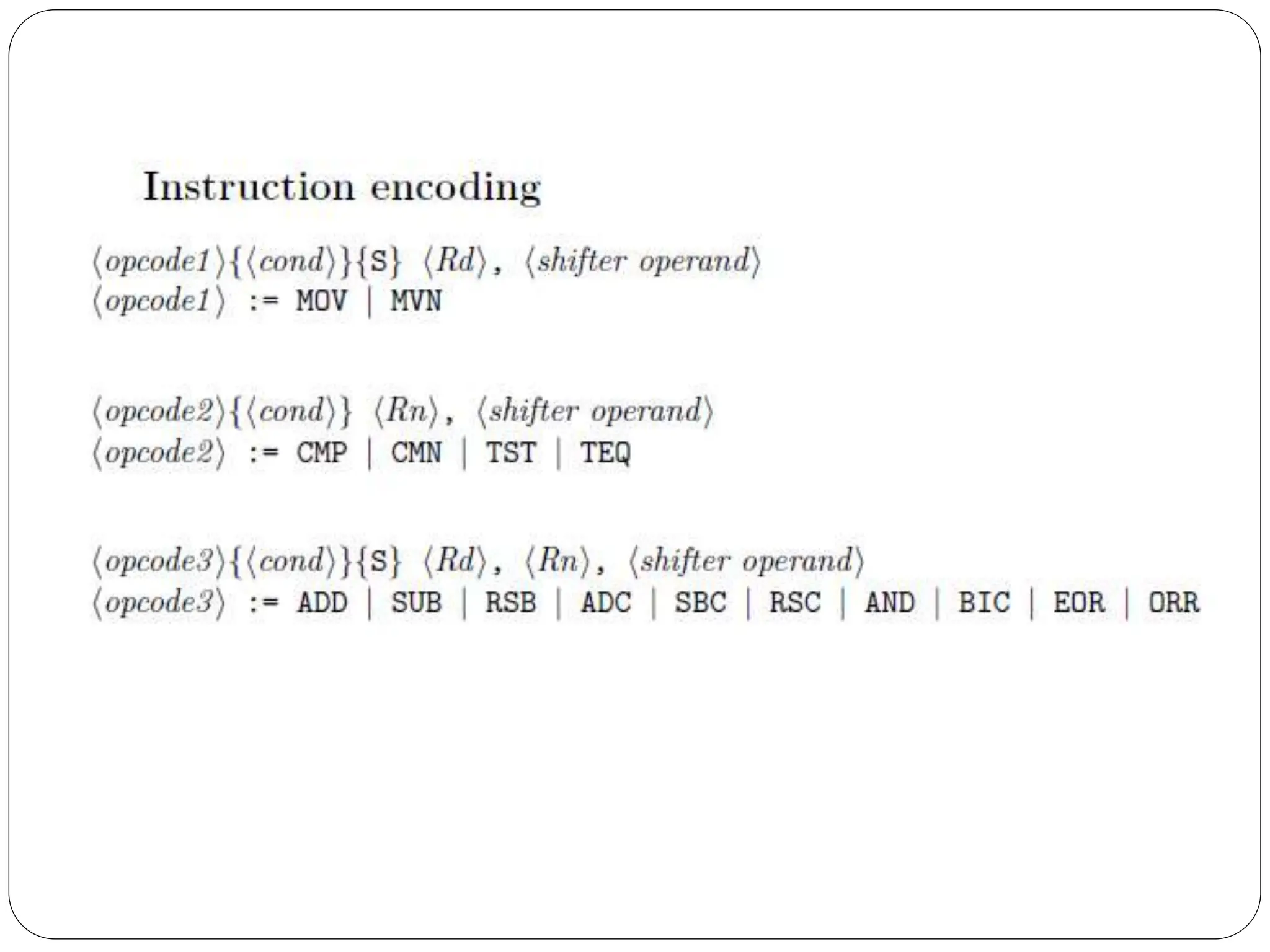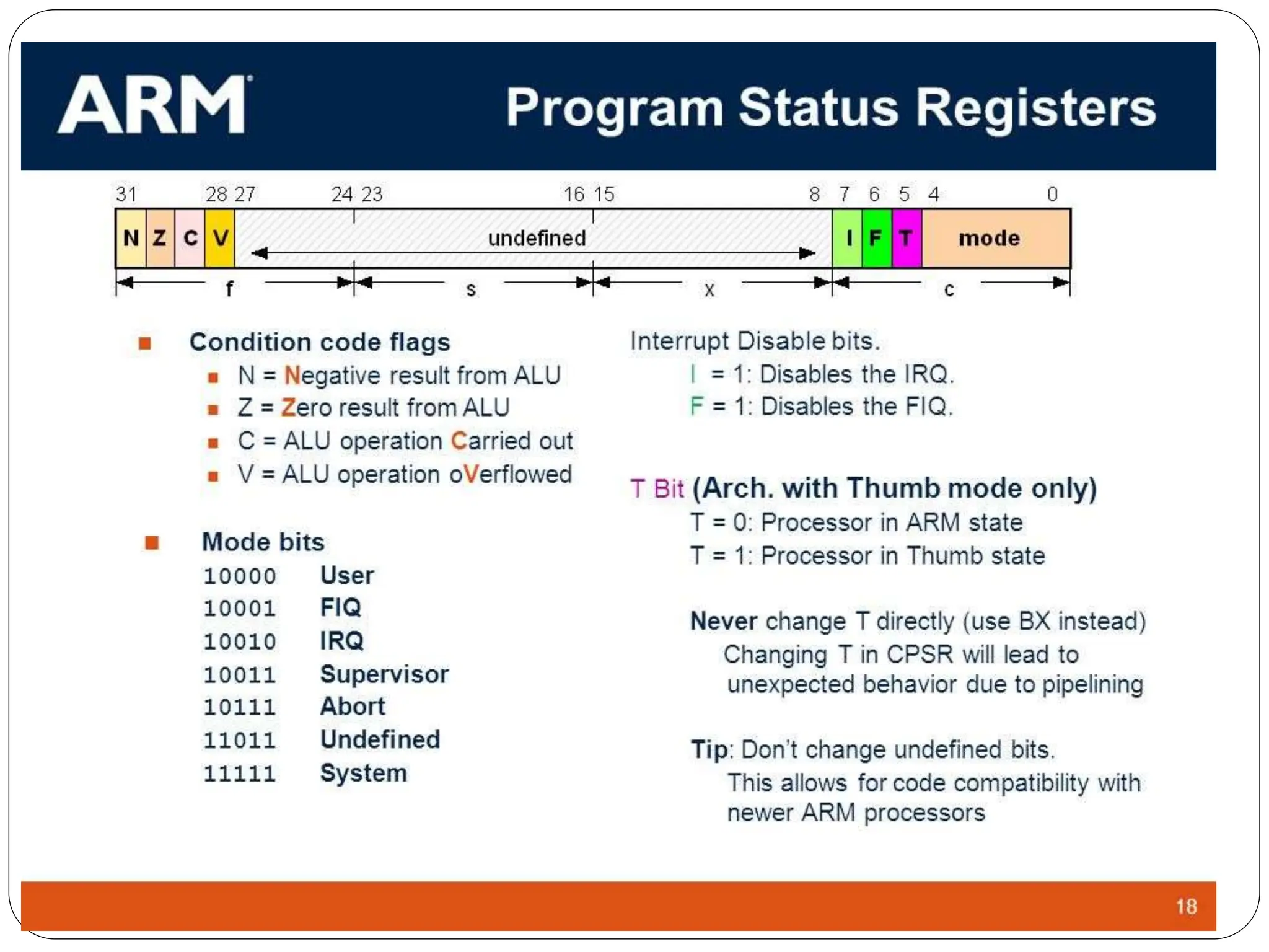 The document details the ARM architecture, describing its reduced instruction set computer (RISC) design, including a load/store data-processing model and various processor modes such as user, supervisor, and interrupt modes. It outlines the structure of ARM's registers, including general-purpose, status, stack pointer, link register, and program counter, and explains the role of condition code flags in managing execution flow. Additionally, the document covers ARM's instruction set categories, specific instructions (like arithmetic and data movement), and the handling of exceptions during operation.