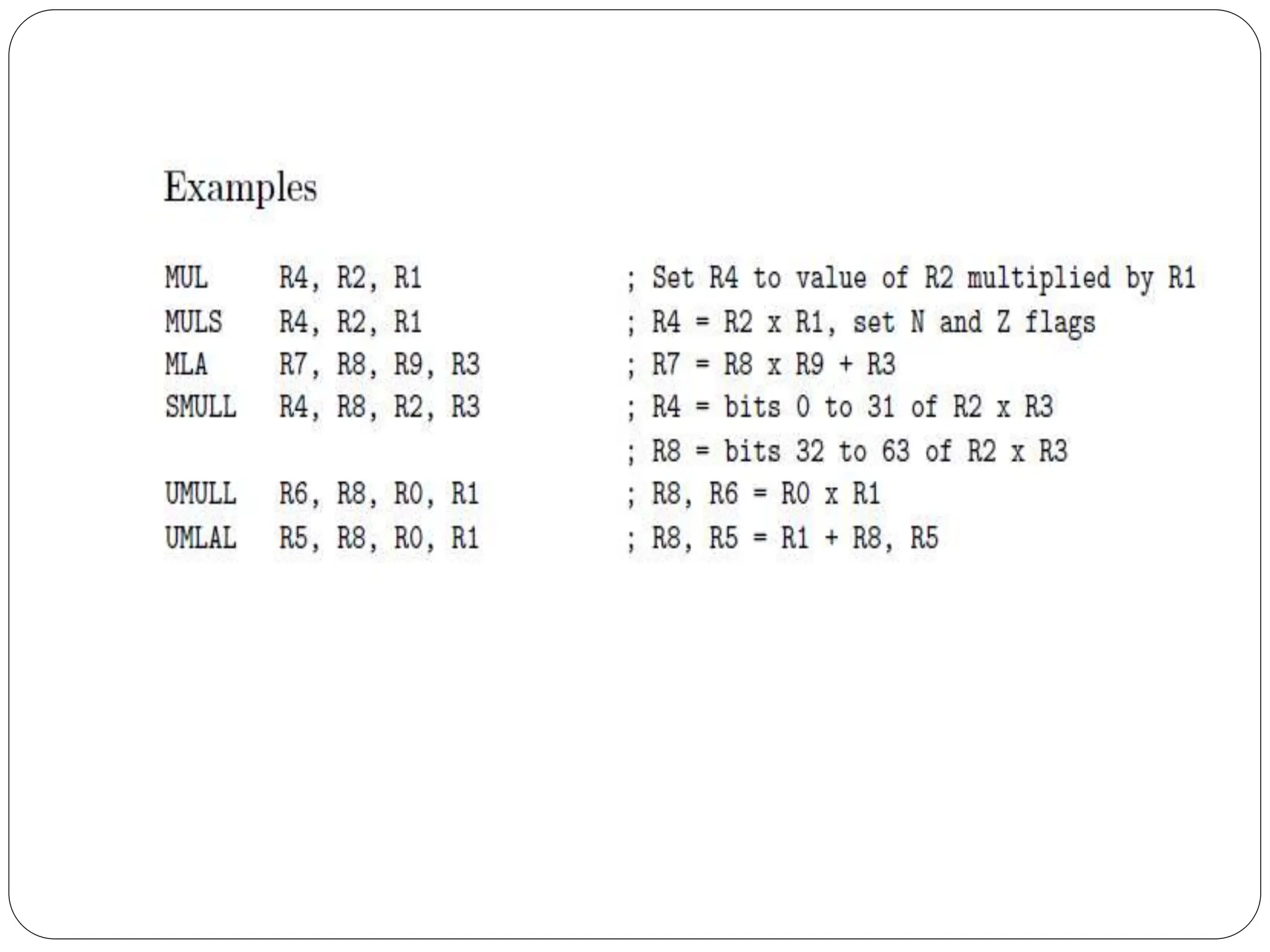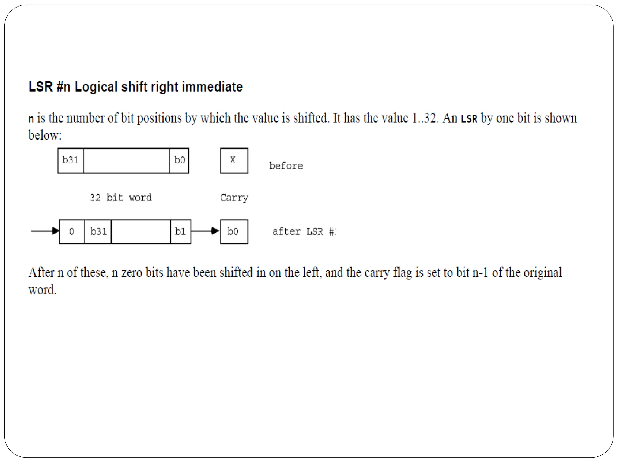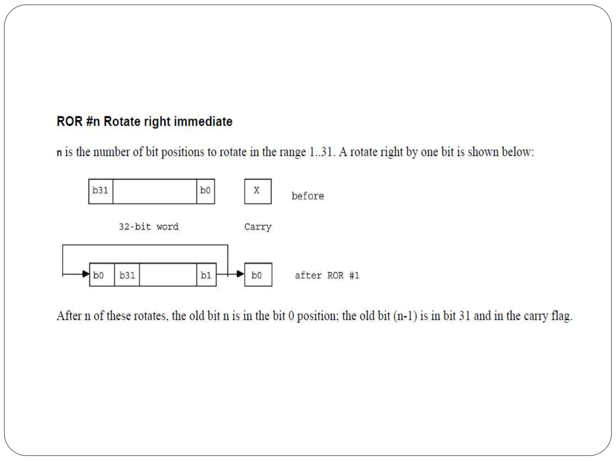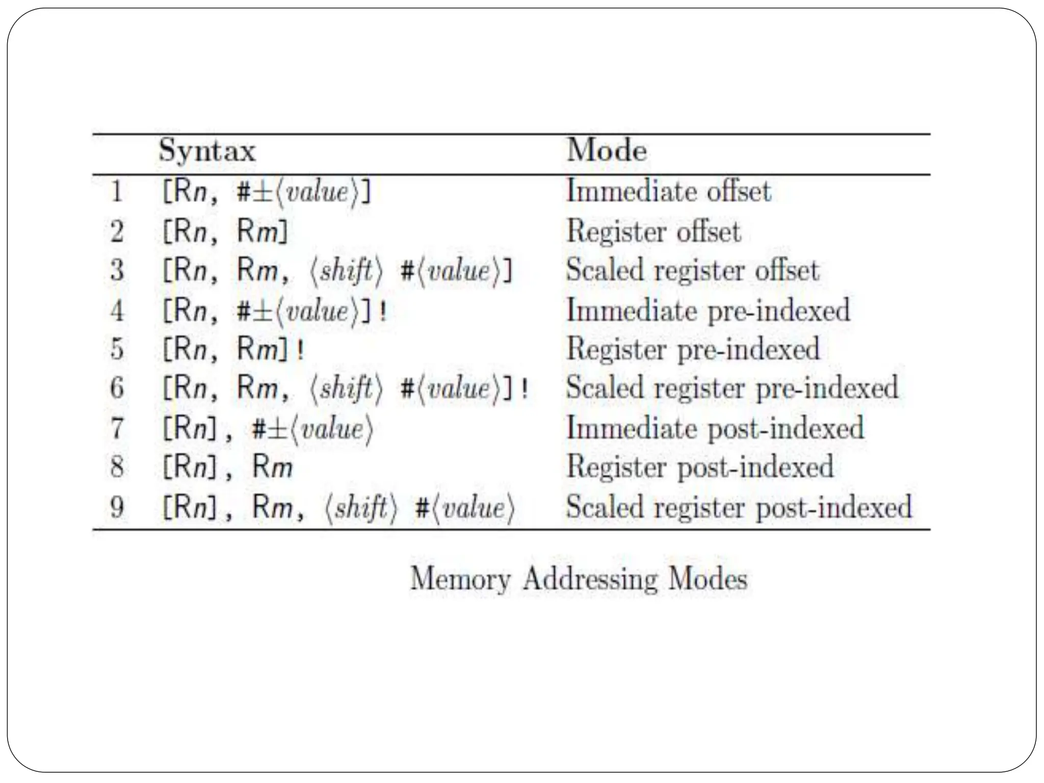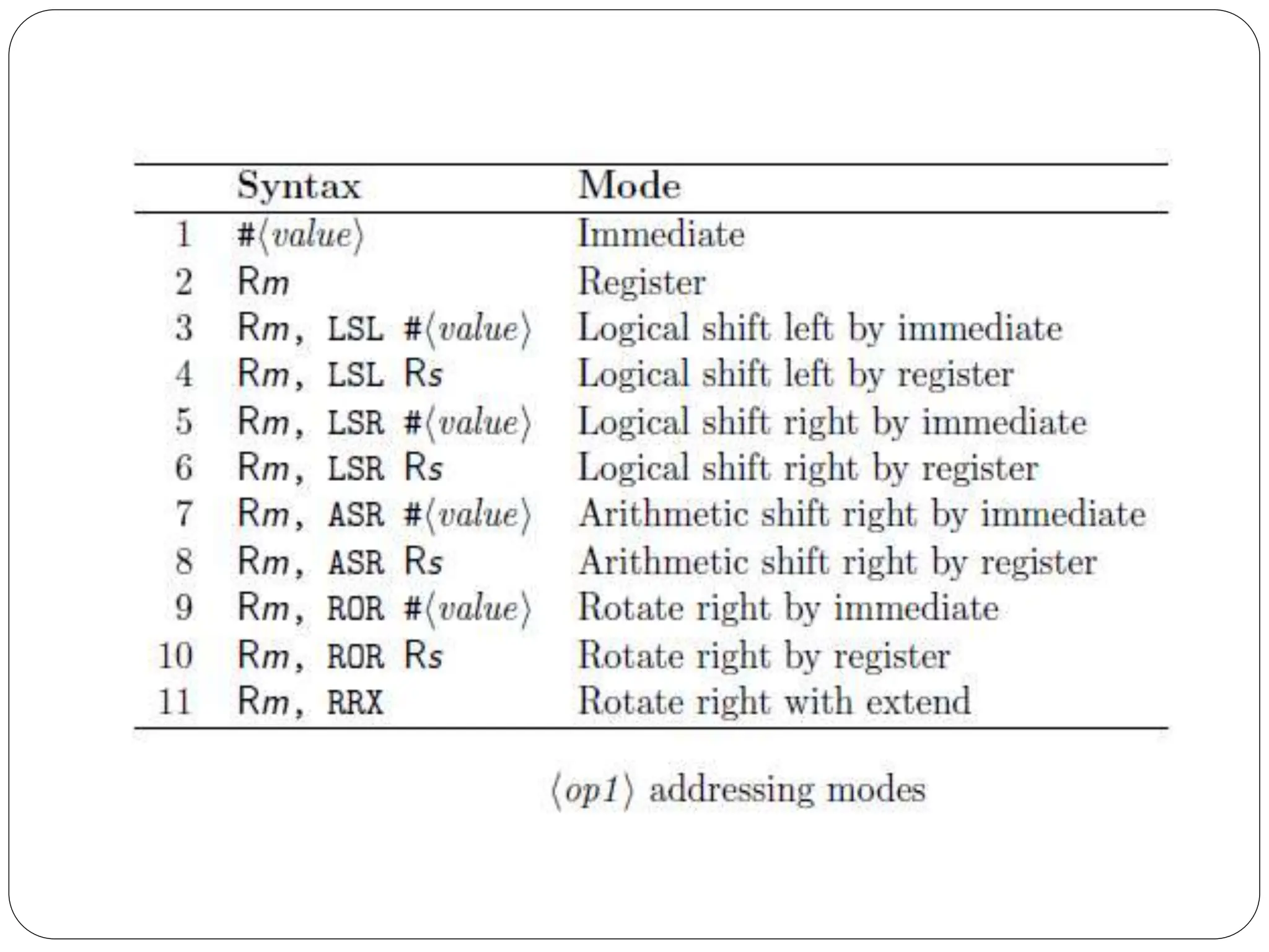 The document details the ARM architecture, describing its reduced instruction set computer (RISC) design, including a load/store data-processing model and various processor modes such as user, supervisor, and interrupt modes. It outlines the structure of ARM's registers, including general-purpose, status, stack pointer, link register, and program counter, and explains the role of condition code flags in managing execution flow. Additionally, the document covers ARM's instruction set categories, specific instructions (like arithmetic and data movement), and the handling of exceptions during operation.