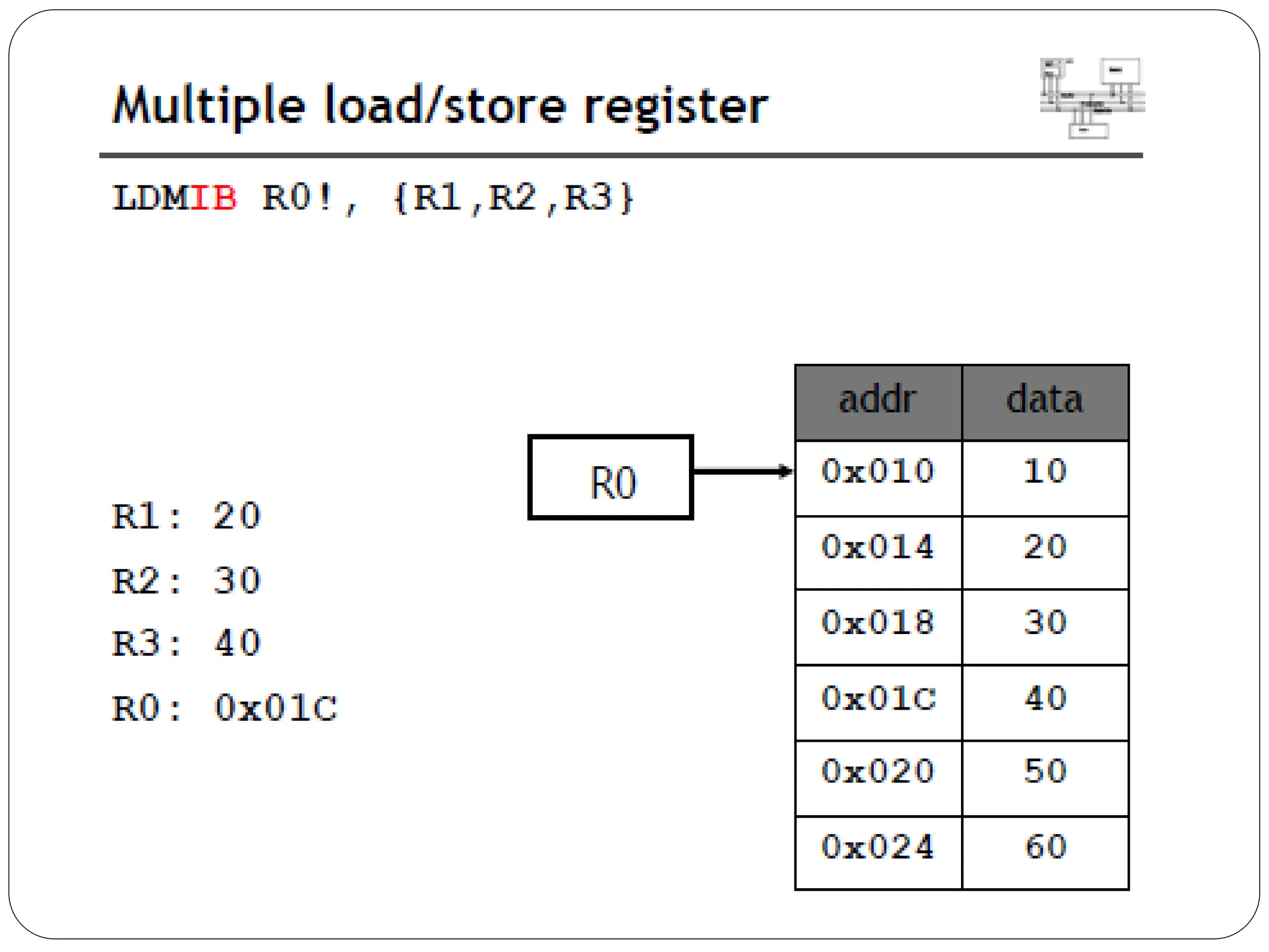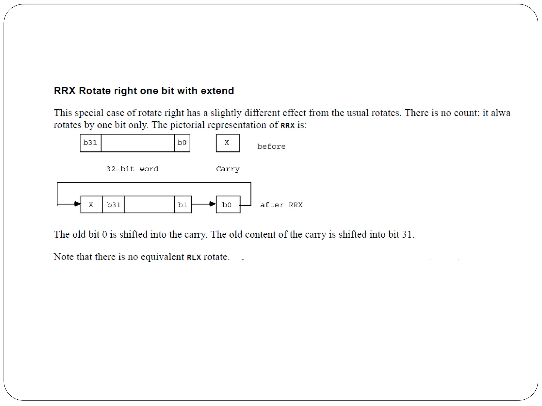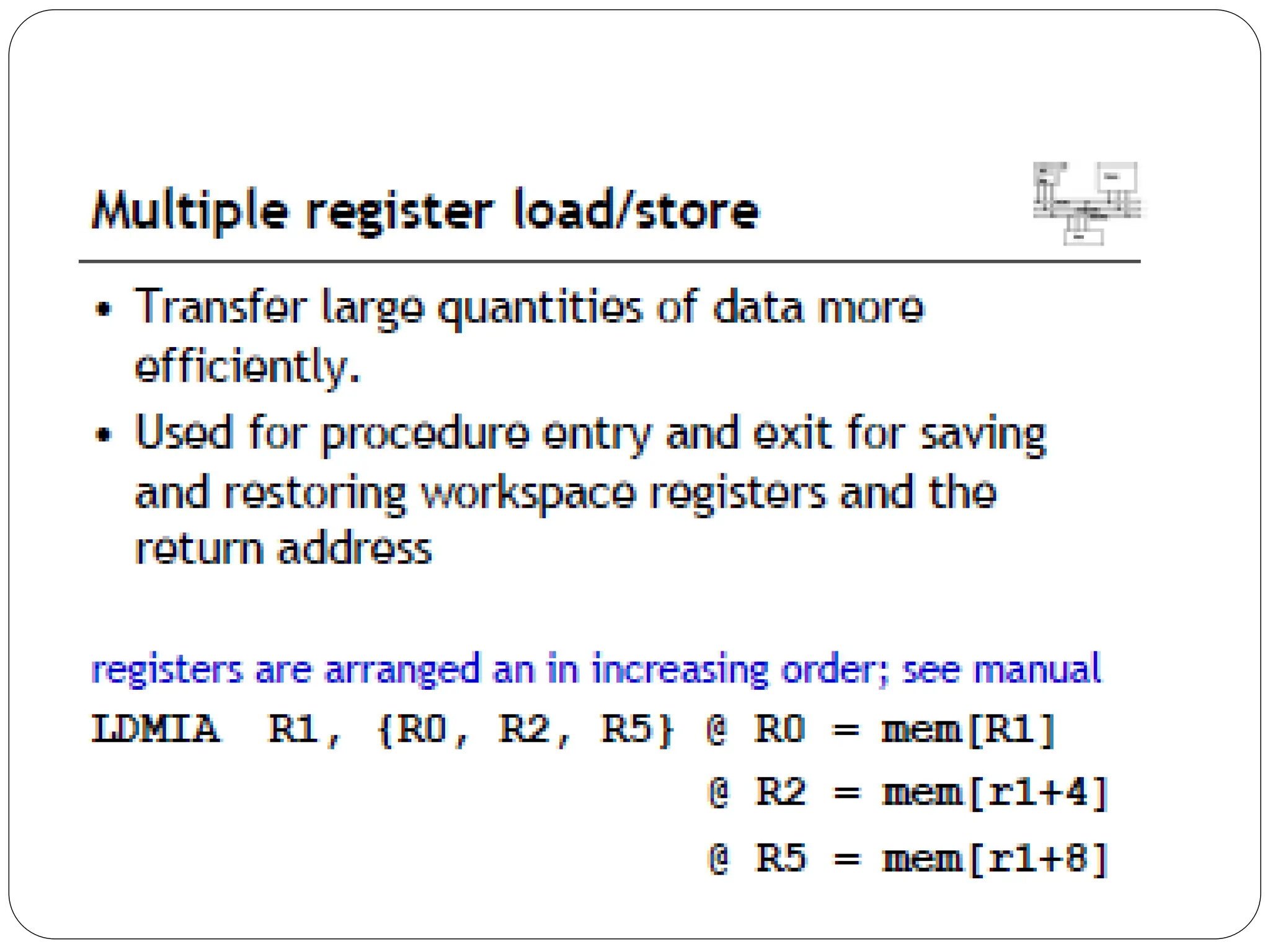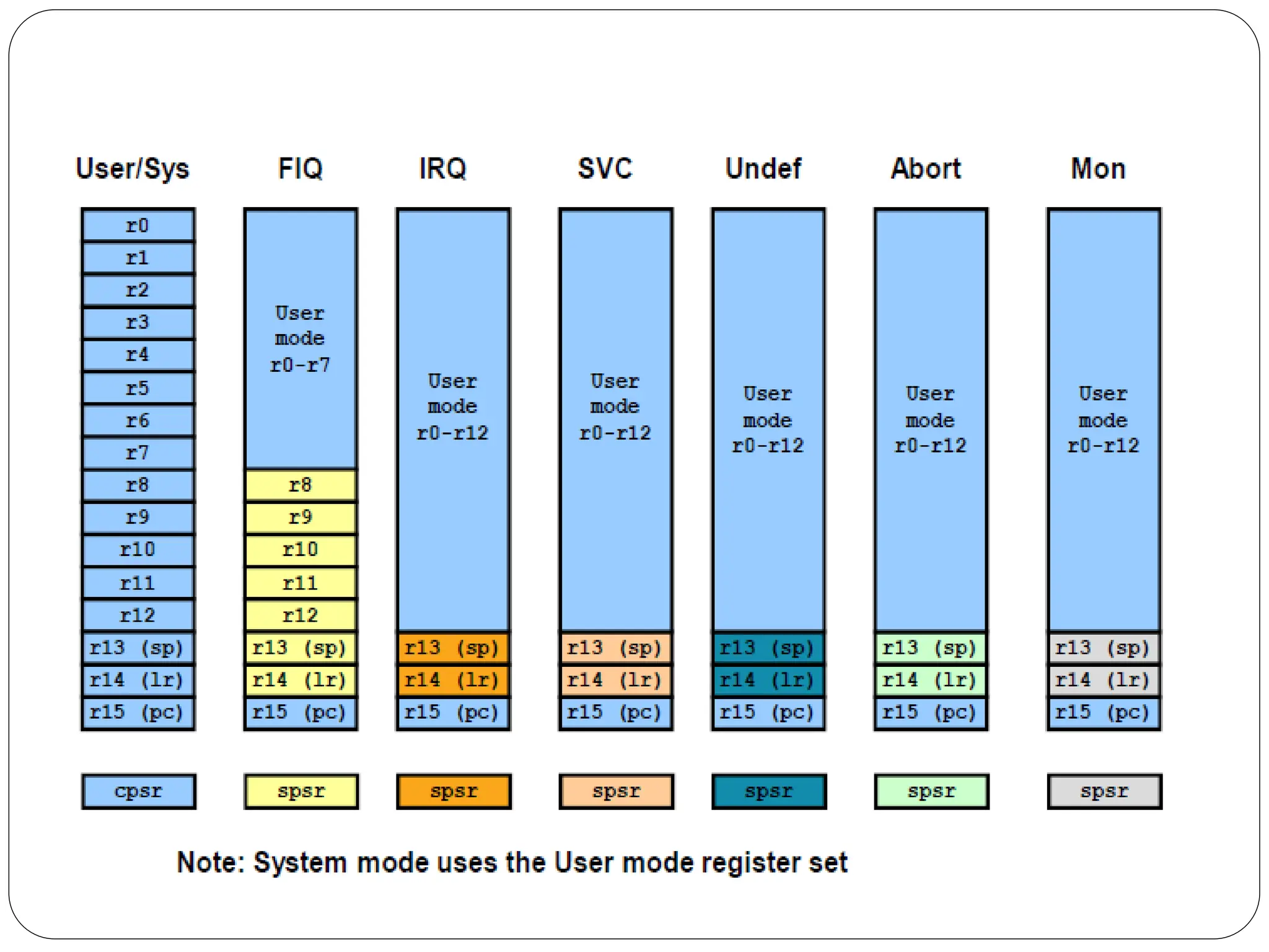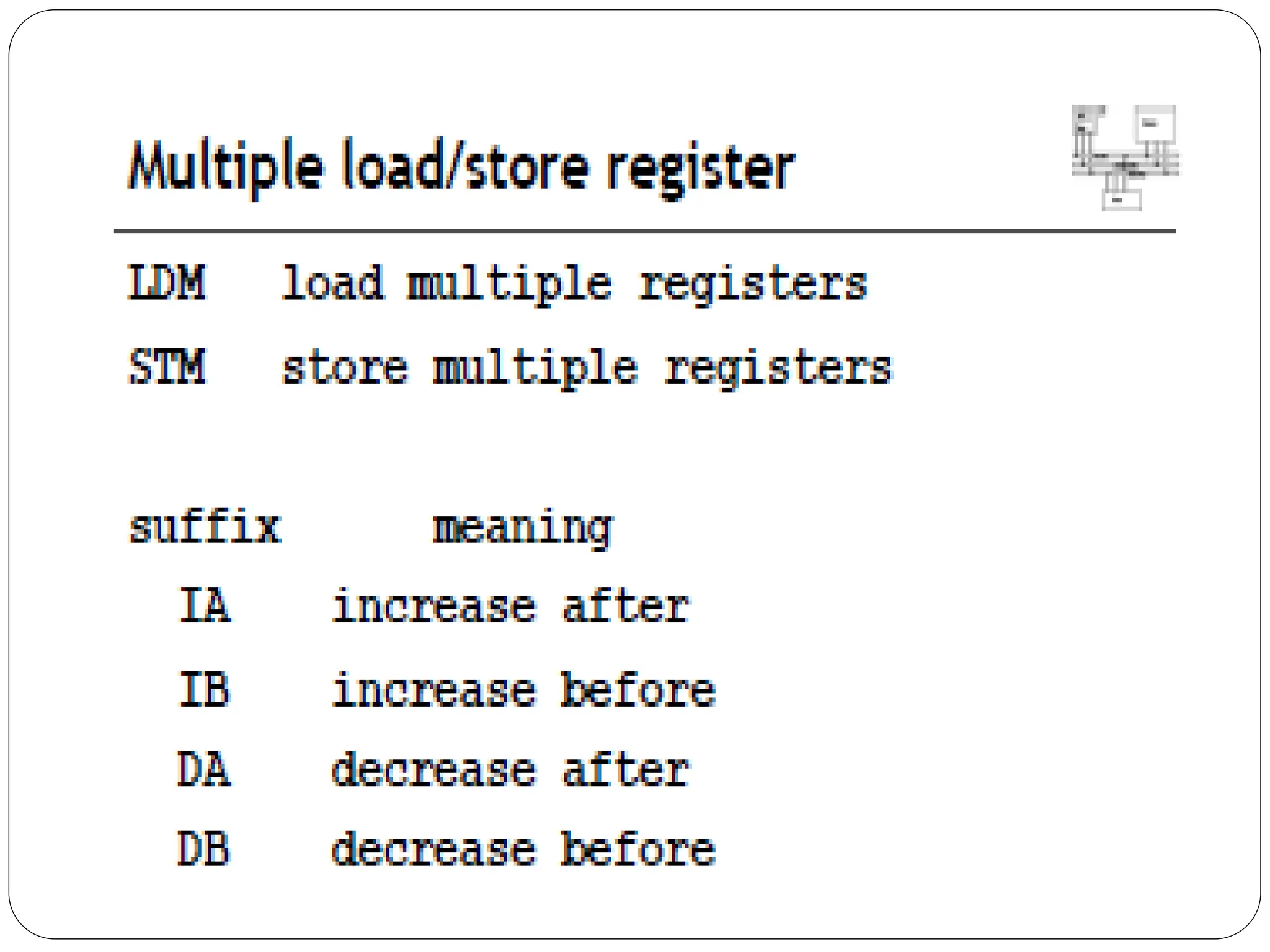 The document details the ARM architecture, describing its reduced instruction set computer (RISC) design, including a load/store data-processing model and various processor modes such as user, supervisor, and interrupt modes. It outlines the structure of ARM's registers, including general-purpose, status, stack pointer, link register, and program counter, and explains the role of condition code flags in managing execution flow. Additionally, the document covers ARM's instruction set categories, specific instructions (like arithmetic and data movement), and the handling of exceptions during operation.
