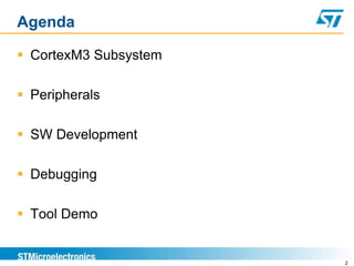This document provides an overview of the ARM Cortex-M3 subsystem and its peripherals. It discusses the Cortex-M3 processor core and its features like the pipeline, instruction set, registers and exception handling. It also describes the peripherals like DMA, UART, timers and watchdog. The document outlines the development tools like uVision IDE and debugger. It discusses the software development flow including building, downloading and debugging programs on the target board.