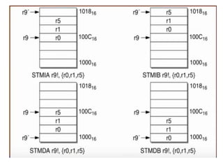 2) Data transfer instructions that move values between registers and memory, including single register and multiple register load/store instructions.