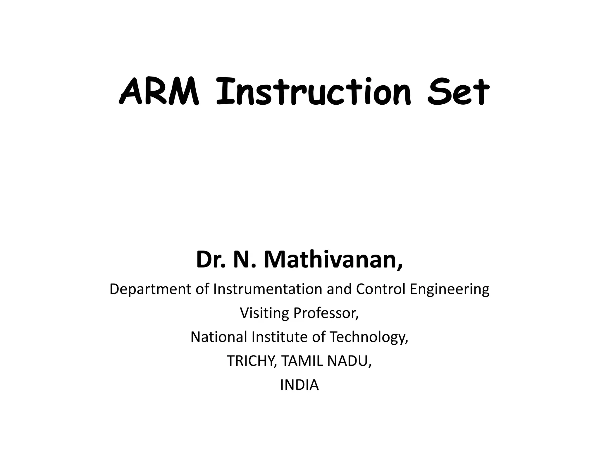 The document provides an overview of the ARM instruction set architecture, detailing its two main instruction sets: ARM state (32-bit) and Thumb state (16-bit). It covers features, such as conditional execution, various types of instructions (data processing, branching, load-store), and examples of operations, including arithmetic and memory transfer instructions. Additionally, it illustrates how ARM assembly language constructs can optimize control flow and data handling in processor operations.