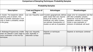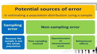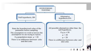 The document covers key concepts related to sampling and hypothesis testing, including the definitions of population, sample, sampling frame, and common sampling methods such as probability and non-probability sampling. It details the sampling process, including defining target populations, determining sample sizes, and addressing sampling errors. Furthermore, it discusses various sampling techniques like simple random sampling, systematic sampling, cluster sampling, and quota sampling, alongside the significance of estimating errors in research methodologies.