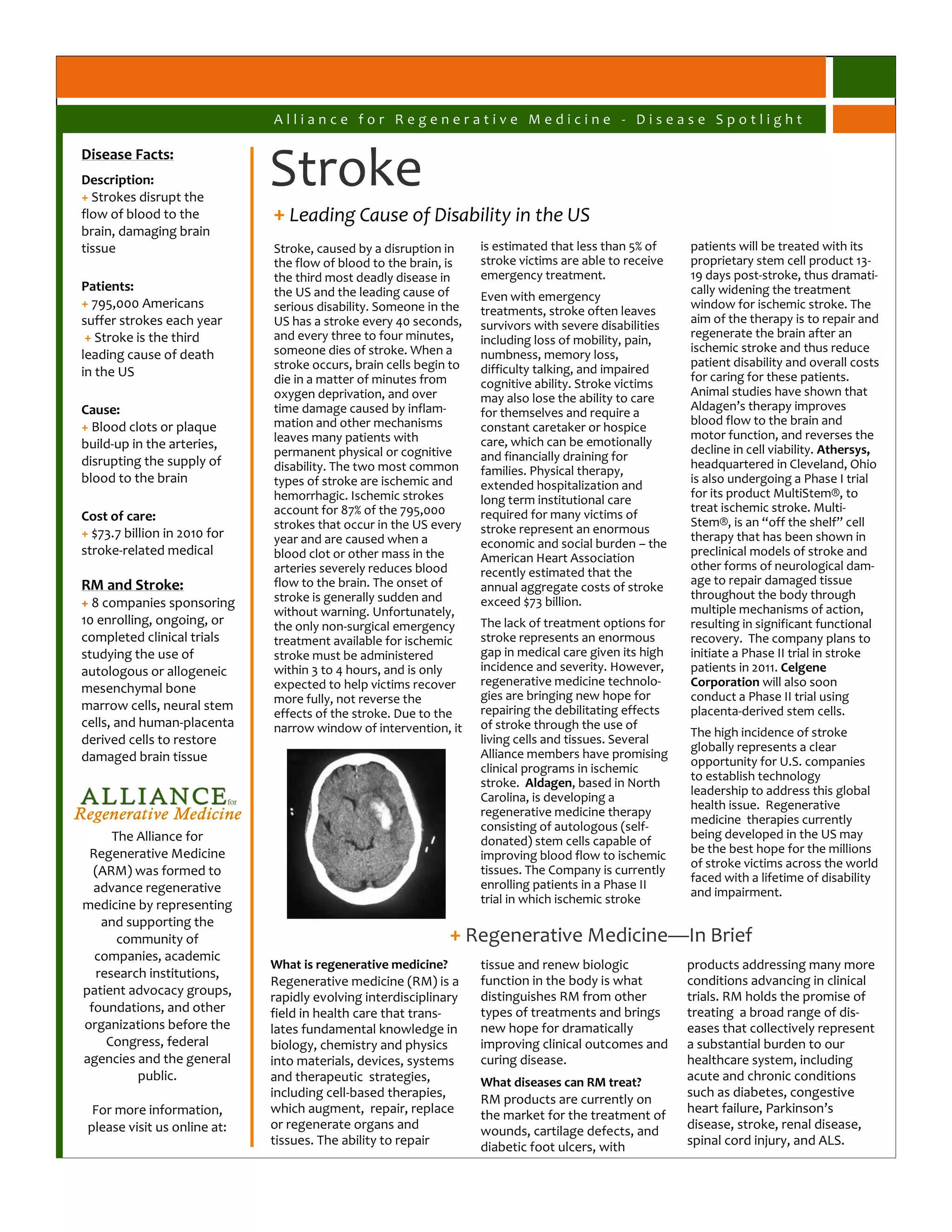 Strokes are a leading cause of disability in the US, with 795,000 Americans suffering strokes each year. Strokes occur when blood flow to the brain is disrupted, damaging brain tissue. Currently, only limited emergency treatments are available within 3-4 hours of the stroke. Regenerative medicine therapies are bringing hope to repair stroke damage by using stem cells and other living cells and tissues. Several companies are studying therapies using mesenchymal stem cells, neural stem cells and placental cells. These therapies aim to regenerate damaged brain tissue and reduce disability after stroke.
