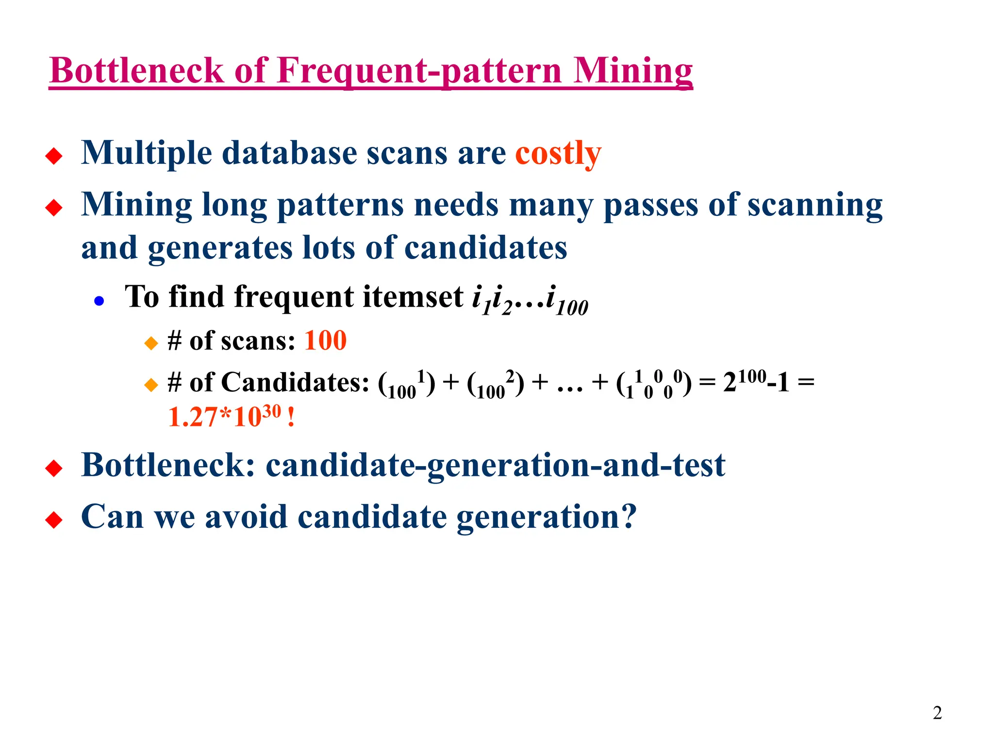 The document discusses the frequent pattern tree (FP-tree) structure for efficiently mining frequent patterns without candidate generation. It describes how an FP-tree compresses a transaction database into a tree structure that preserves all frequent itemsets. The FP-growth algorithm recursively mines the FP-tree to discover all frequent patterns by creating conditional pattern bases and conditional FP-trees. FP-growth avoids multiple database scans and candidate generation, making it faster than the Apriori algorithm. However, it is dependent on support threshold and cannot handle incremental updates.