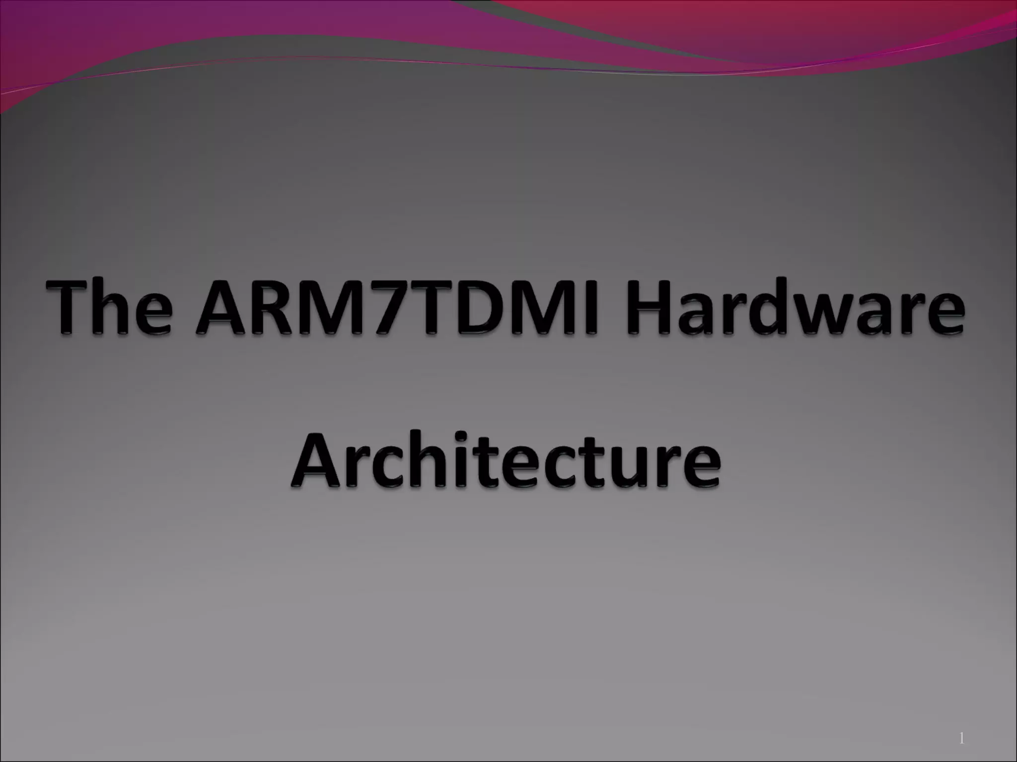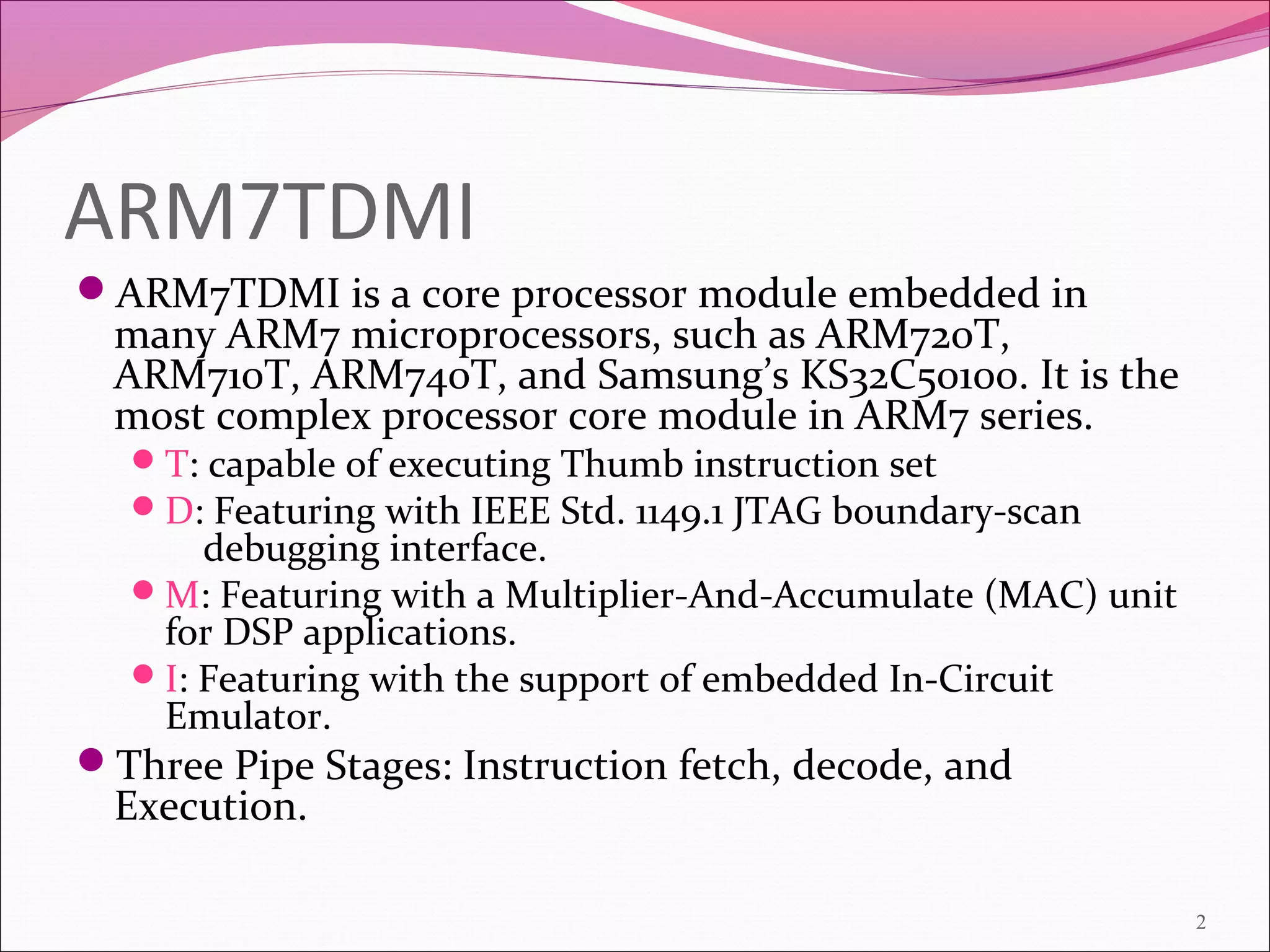 The document describes the ARM7TDMI processor core. It is a 32-bit RISC processor capable of executing 16-bit Thumb instructions. It features a JTAG debugging interface, multiplier, and support for embedded emulation. It has a three-stage pipeline and interfaces with memory using different bus cycles.