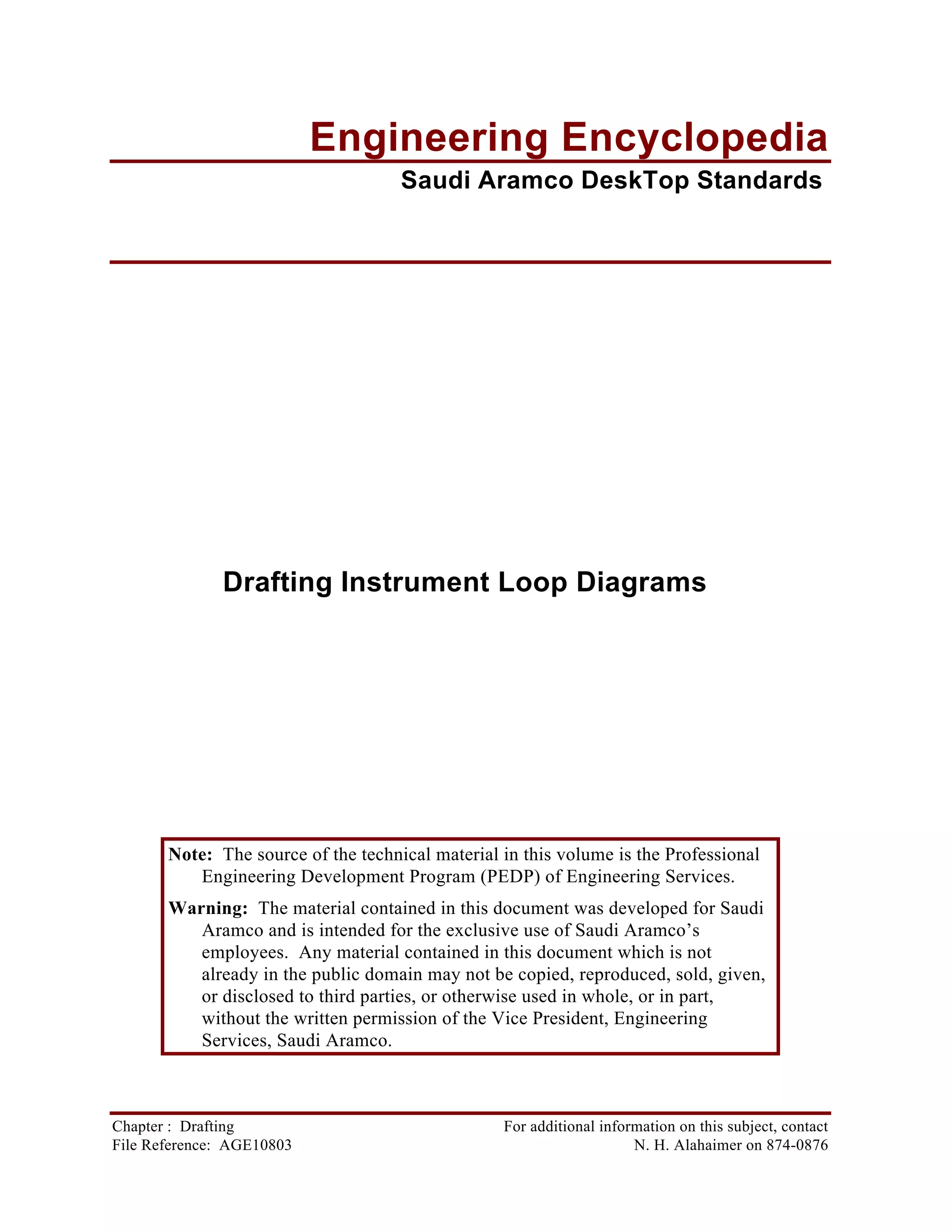 The document provides information on drafting instrument loop diagrams (ILDs) including common symbols and abbreviations used in ILDs. Some key symbols described are for orifice plates, control valves, electrical switches, lamps/lights, and different types of lines. ILDs provide detailed information about instrument control loops and are commonly used in drawings at Saudi Aramco.