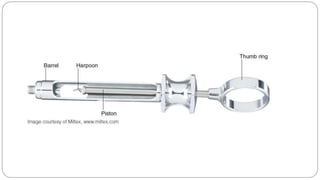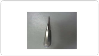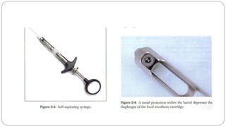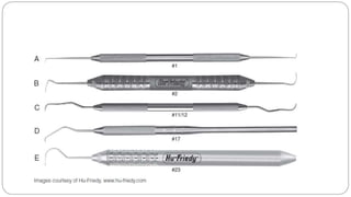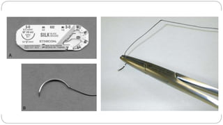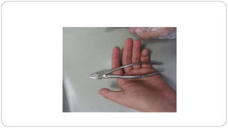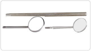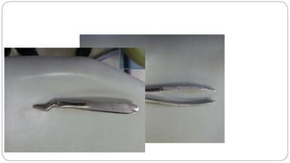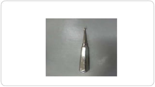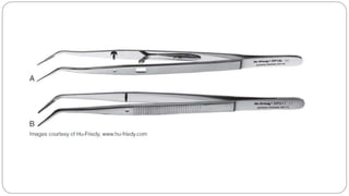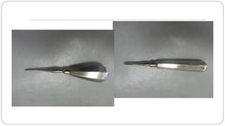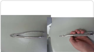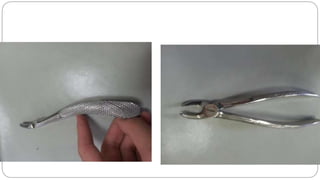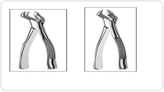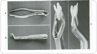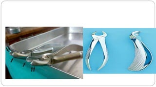 This document provides an overview of common instruments used in oral surgery procedures. It describes the purpose, features and clinical applications of basic extraction sets, local anesthesia equipment, elevators, forceps, hemostats, suture needles and various other instruments. Extraction forceps are discussed in detail, outlining the components and designs of different forceps used for extracting teeth in the upper and lower jaws. The document aims to inform readers about the armamentarium and equipment used for basic oral surgical procedures.