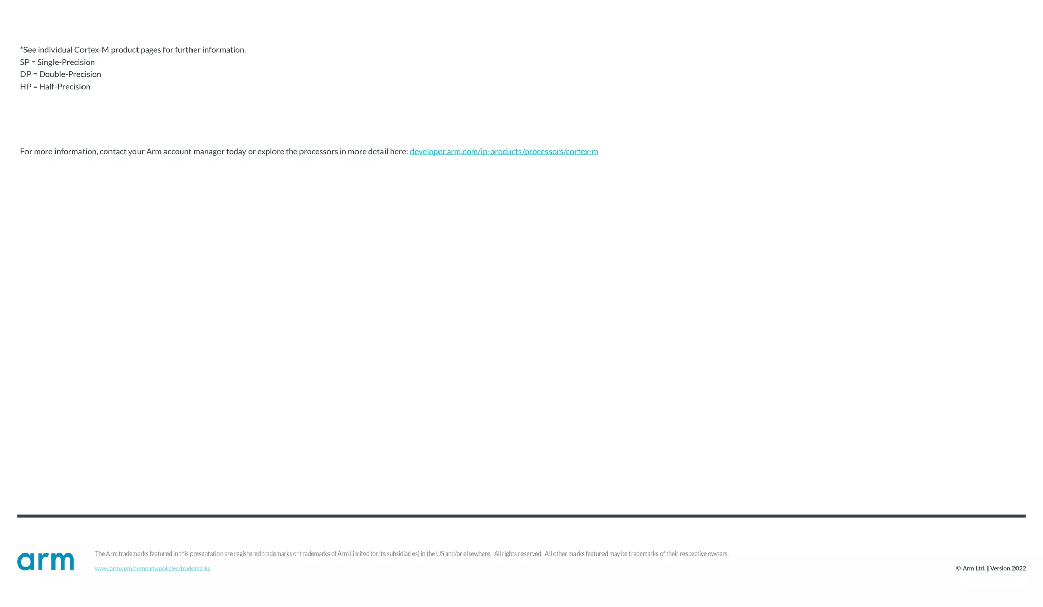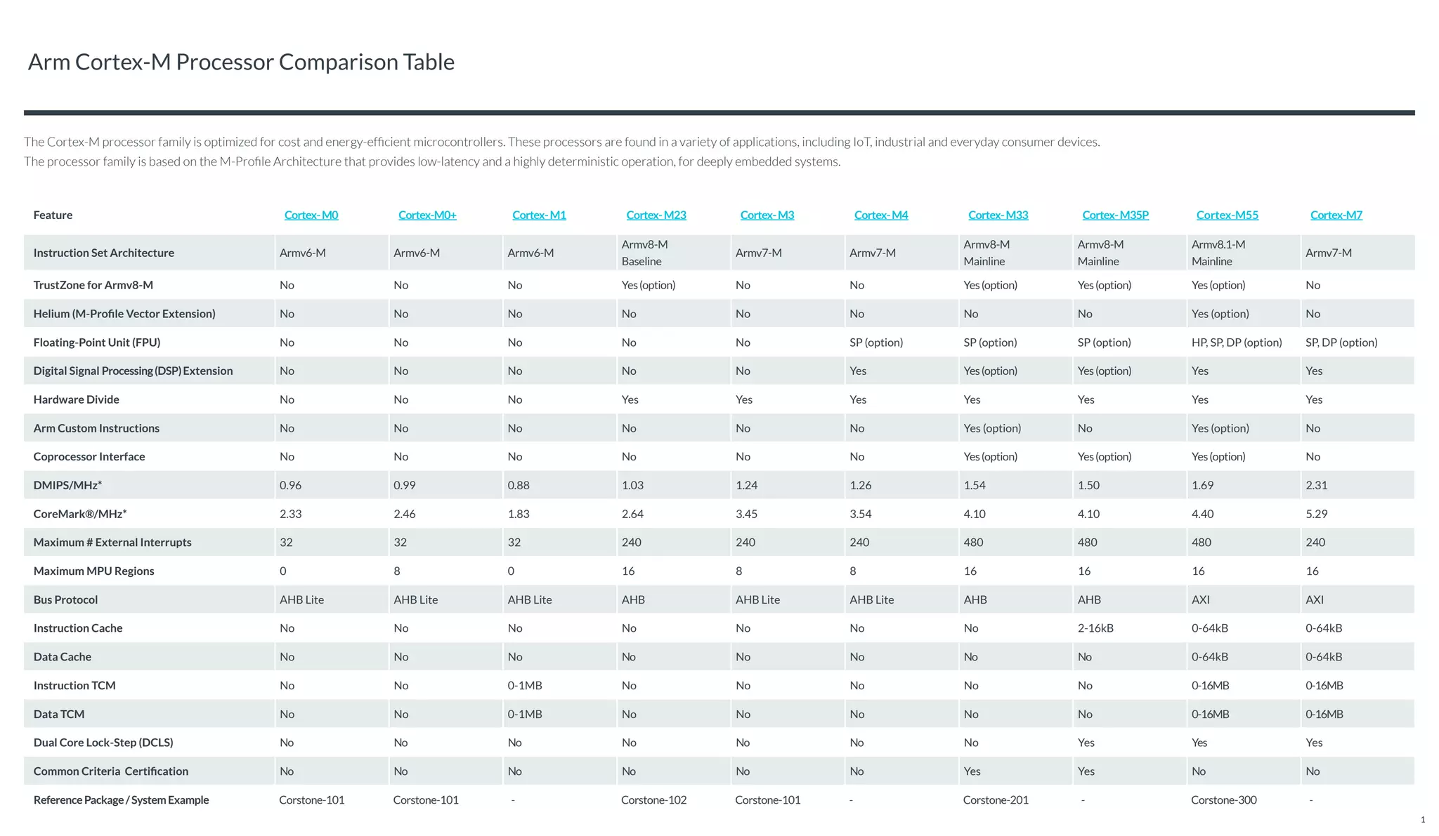 Feature Cortex-M0 Cortex-M0+ Cortex-M1 Cortex-M23 Cortex-M3 Cortex-M4 Cortex-M33 Cortex-M35P Cortex-M55 Cortex-M7