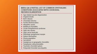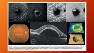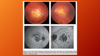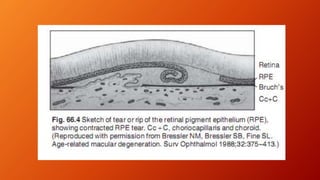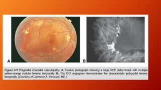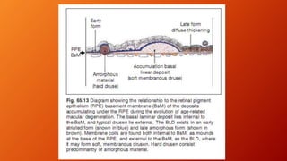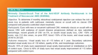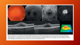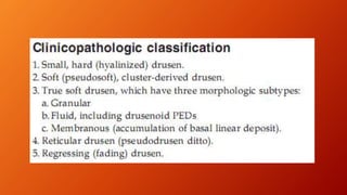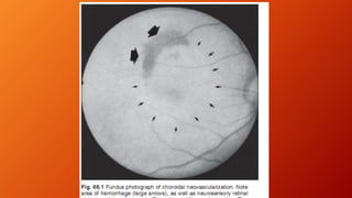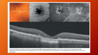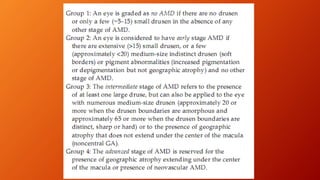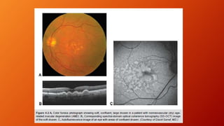 Age-related macular degeneration (AMD) is the leading cause of irreversible vision impairment among the elderly, affecting millions and characterized by degeneration of retinal structures. It presents mainly in two forms: dry (non-neovascular) and wet (neovascular), with specific risk factors and treatment options, including vitamin supplementation for dry AMD and anti-VEGF medications for wet AMD. The disease progresses variably, and while new treatments have improved outcomes for wet AMD, management of dry AMD remains limited and requires ongoing patient education regarding risk factors and symptoms.