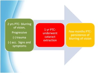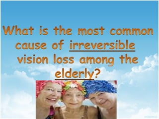 This case presentation summarizes the medical history and ocular examination findings of a 69-year-old Filipino woman. She has a history of hypertension, cataract surgery, and is a former smoker. Her ocular exam revealed decreased vision and color perception in both eyes consistent with age-related macular degeneration. Based on her clinical features and angiography results, she was diagnosed with non-neovascular age-related macular degeneration. Risk factors, screening, and management options for this common cause of vision loss were discussed.