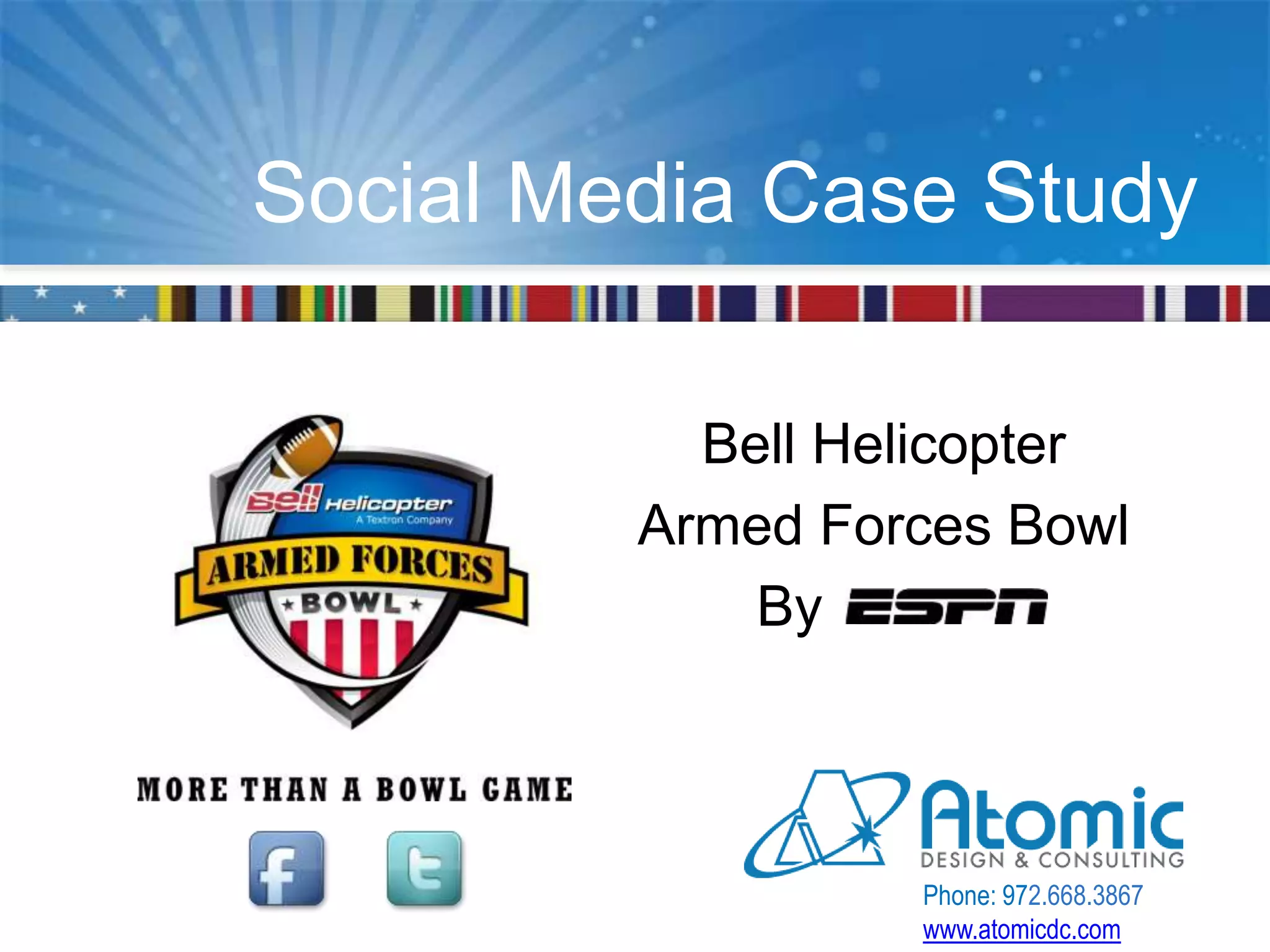 The social media case study summarizes a campaign for the Bell Helicopter Armed Forces Bowl to attract fans and boost interactions on social media with a limited $500 budget. Key elements included sponsor promotions like a "Where is the Bell Helicopter?" contest, in-game activities, targeted Facebook ads, and engaging with military-related pages around Veterans Day. The campaign saw over 28% growth in Facebook fans, 40% growth in Twitter followers, and positive feedback from sponsors.