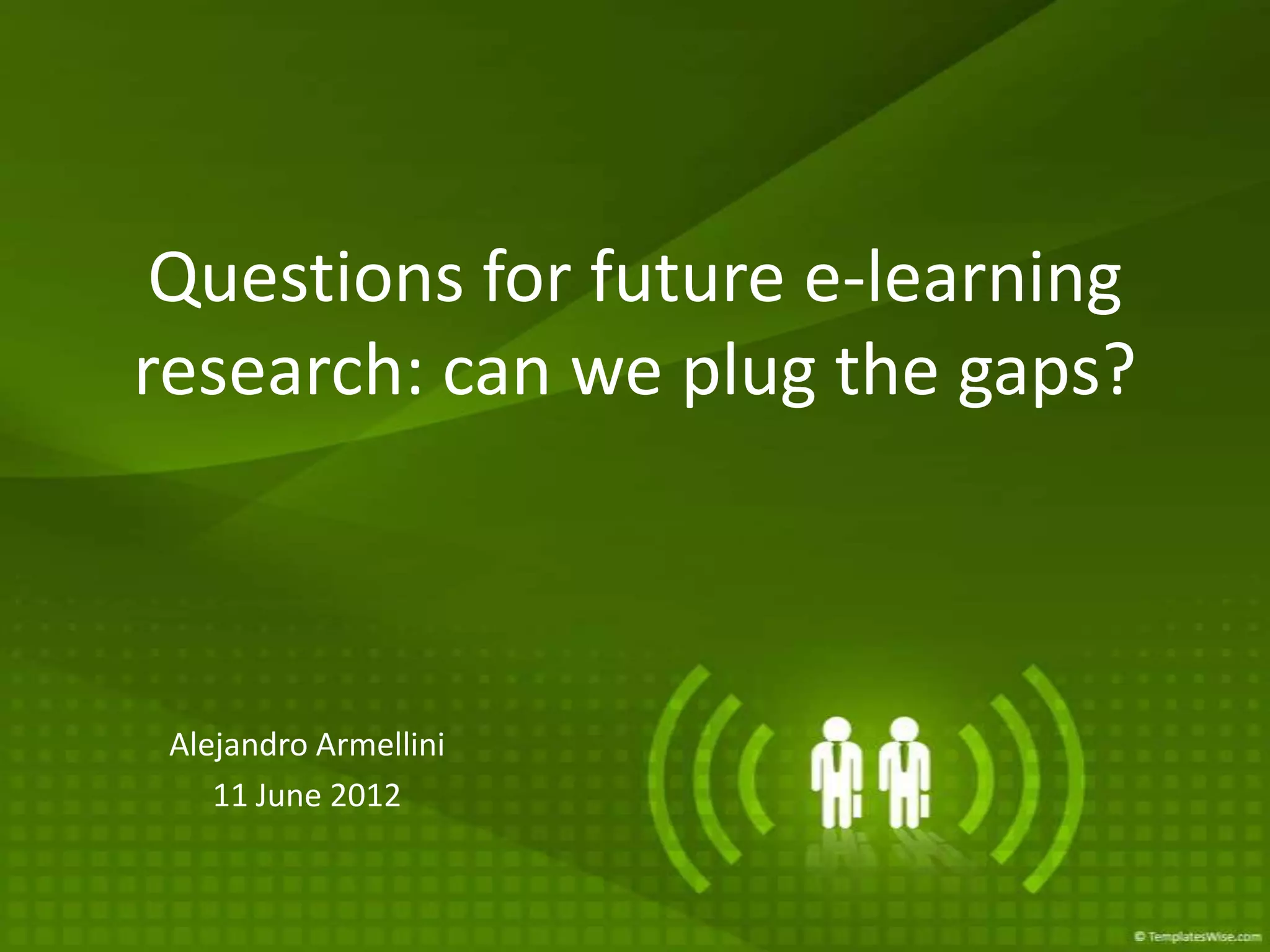 This document summarizes a presentation on future directions for e-learning research. It identifies 7 strategic priorities for e-learning development, including building capacity for learning design and assessment, enabling innovation and evaluation, and integrating technology and pedagogy. It also outlines 5 principles for learning design, a model for innovation, and broad themes for future research like open educational resources and mobile learning. Overall, the presentation calls for a strategic and evidence-based approach to integrating technology and pedagogy to improve the learner experience.