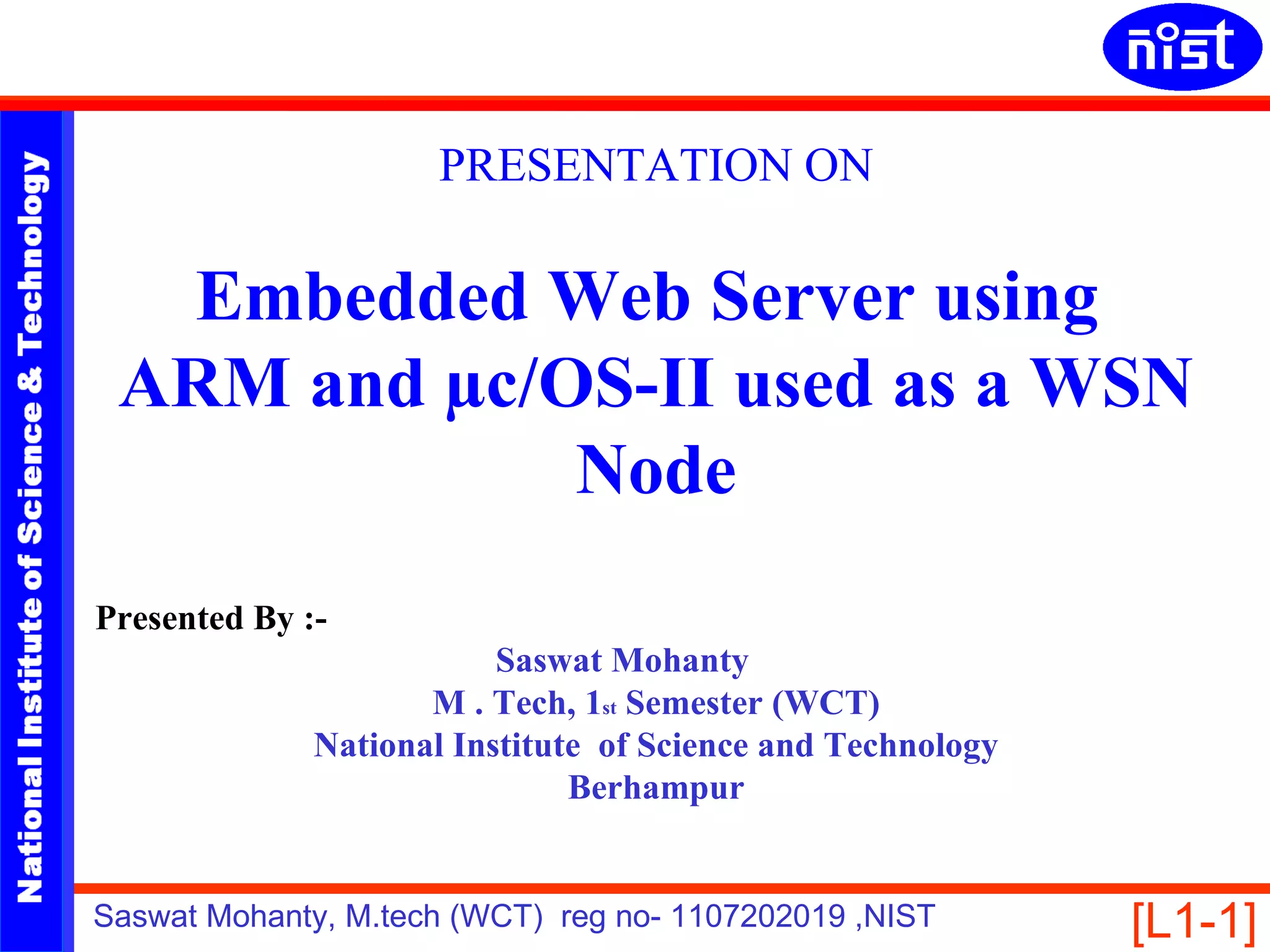 Saswat Mohanty presented on developing an embedded web server using an ARM processor and μC/OS-II real-time operating system. The presentation covered the ARM development board used, advantages of ARM for low power and the μC/OS-II RTOS. It described the process of porting μC/OS-II and a webserver to the ARM, integrating components, and testing the system. Potential uses of the embedded web server were also discussed.