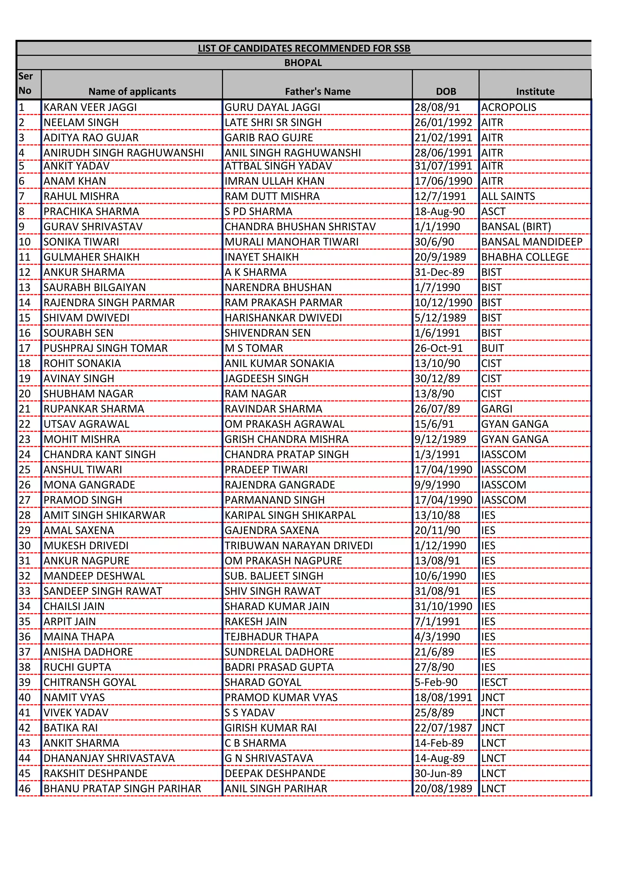 This document lists 129 candidates recommended for the Services Selection Board (SSB) in Bhopal. It includes each candidate's name, father's name, date of birth, and the institute they attended. The candidates are recommended from various colleges and institutions around Bhopal.
