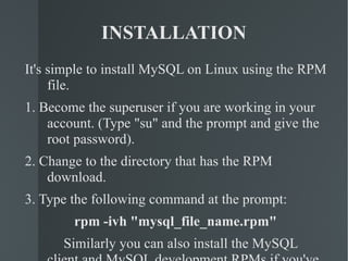 MySQL is a database management system where data is stored in tables which consist of columns and rows. The document provides instructions on installing MySQL on Linux using RPM files and setting the root password. It also describes some basic MySQL concepts like queries, creating/modifying tables, and joining tables.