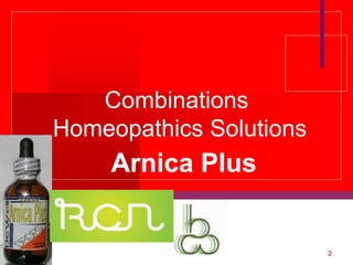 This document provides information on the homeopathic combination product Arnica Plus, which contains 12 homeopathic ingredients used to treat pain, inflammation, and fever. The document lists each ingredient, its botanical name and source, and key symptoms it is used to treat. It then provides more detailed information on 7 of the 12 ingredients, including their uses, key indications, and supporting research on their effects.