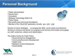 This document summarizes a panel discussion on using social media and networking for civic engagement. It outlines opportunities like easily connecting people and mobilizing activism. Potential downsides include lack of structure, anonymity, and polarization. The vision is for a connected citizenry that increases understanding and holds government accountable through streamlined policymaking. However, obstacles like uninformed decision-making and siloed networks must be addressed. The document advocates for renewed civic education and more responsive government partnered with responsible citizens.