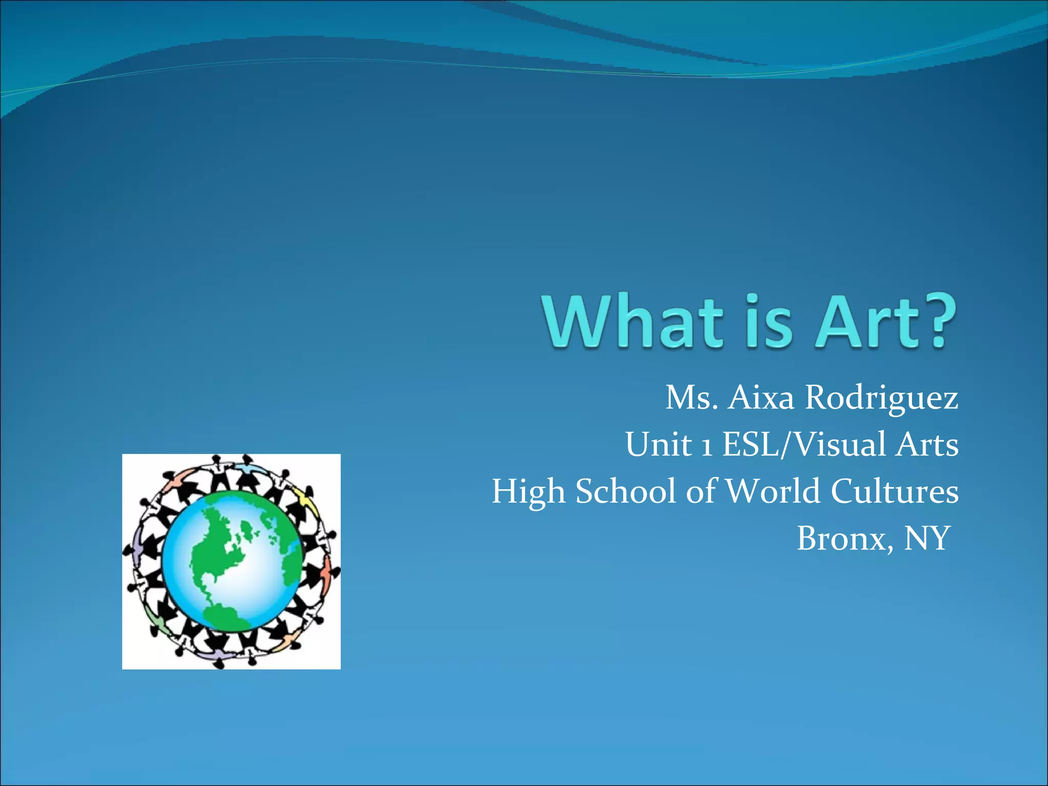 The document defines key terms related to visual art, including art, artist, fine art, applied art, and visual culture. It then explains the basic visual elements or "vocabulary" used by artists to create works, including line, color, value, shape, form, space, and texture. Each element is defined and examples are provided. The document also discusses principles of design such as balance, emphasis, contrast, movement, pattern, repetition, unity, harmony, variety, and scale/proportion.