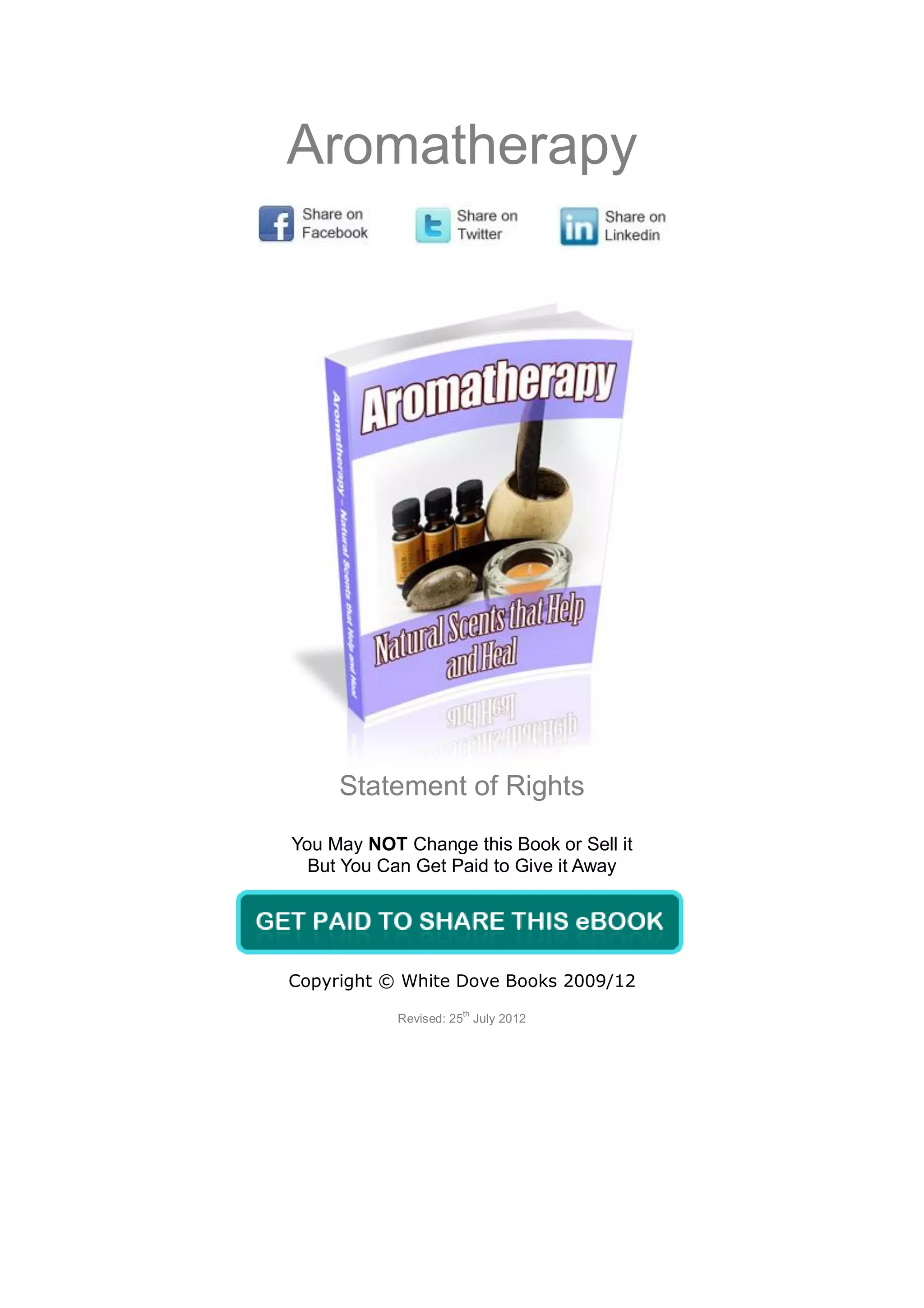 The document covers the principles and historical context of aromatherapy, emphasizing its benefits for mental and physical well-being through the use of essential oils. It includes guidelines on the quality, safety, and potential hazards associated with various essential oils, as well as recommendations for beginner care kits. Legal disclaimers and copyright information are provided, highlighting limitations on modifications and use of the document.