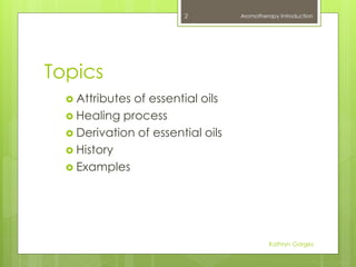 This document provides an introduction to aromatherapy, including definitions, types of oils used, methods of extraction, historical uses, applications for common ailments, and examples of essential oils. Aromatherapy is defined as the holistic treatment of diseases or disorders using aromatic essential oils from plants. The document outlines the healing properties of essential oils, their effects on the body and mind, and how they are derived from plants through various extraction methods like distillation. A brief history of aromatherapy in ancient cultures is also presented, along with common applications and essential oil examples.