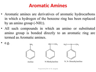 The document provides an in-depth overview of aromatic amines, including their definition, classification into primary, secondary, and tertiary types, and methods of preparation. It discusses their physical properties, various chemical reactions, and basicity, emphasizing the influence of substituents on their chemical behavior. Additionally, it details the synthesis and properties of aryl diazonium salts and their applications in organic synthesis.
