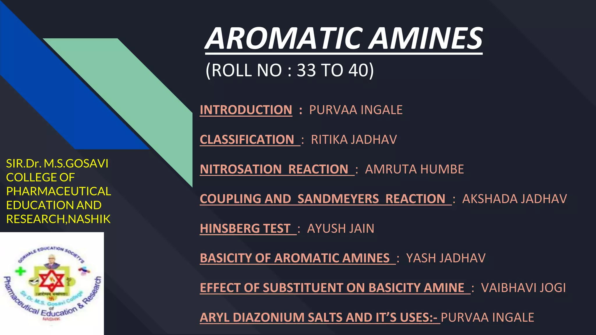 This document provides an overview of aromatic amines. It begins with an introduction noting that aromatic amines are industrially important compounds used to produce dyes, rubbers, and drugs. It then discusses the classification, characteristics, and reactions of aromatic amines. Key points covered include that aromatic amines are weaker bases than aliphatic amines due to delocalization of the nitrogen lone pair onto the aromatic ring. The document also discusses substituent effects on basicity and the uses of aryl diazonium salts in organic synthesis and light-sensitive applications. Presentations were given on specific topics like nitrosation reactions, coupling reactions, and the Hinsberg test.
