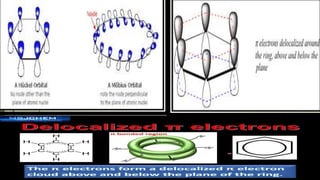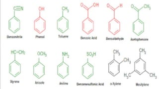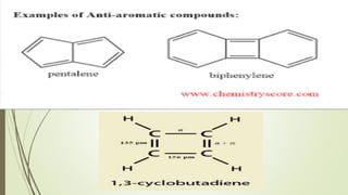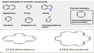 This document provides an overview of aromatic compounds including benzene derivatives, antiaromatic compounds, annulenes, heterocyclic compounds, and metallocenes. It defines aromaticity as involving delocalized pi electrons within a conjugated cyclic system. The key requirements for aromaticity are a cyclic conjugated structure, planarity, and obeying Huckel's rule of 4n+2 pi electrons. Common aromatic heterocycles include furan, pyrrole, thiophene, and pyridine. Ferrocene is provided as an example of a metallocene.