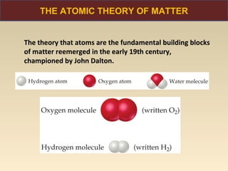 The document discusses the atomic theory of matter and the development of atomic structure models. It describes John Dalton's atomic theory which stated that elements are composed of atoms that are unique and atoms are neither created nor destroyed in chemical reactions. The discovery of the electron by J.J. Thompson and experiments by Robert Millikan and Ernest Rutherford helped develop the modern atomic structure model of a small, dense nucleus surrounded by electrons. The document also discusses isotopes, atomic numbers, mass numbers, and how the periodic table is arranged based on atomic structure.