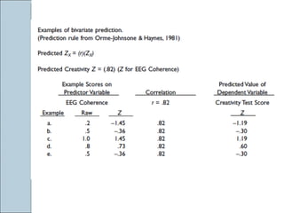 This document discusses correlation and prediction. It defines correlation as the relationship between two variables and explains how scatter diagrams can be used to visualize linear, curvilinear, positive, negative, and no correlations. The correlation coefficient r is introduced as a measure of both the direction and strength of the correlation between two variables. Prediction models are described as using the predictor variable to predict scores on the criterion variable.