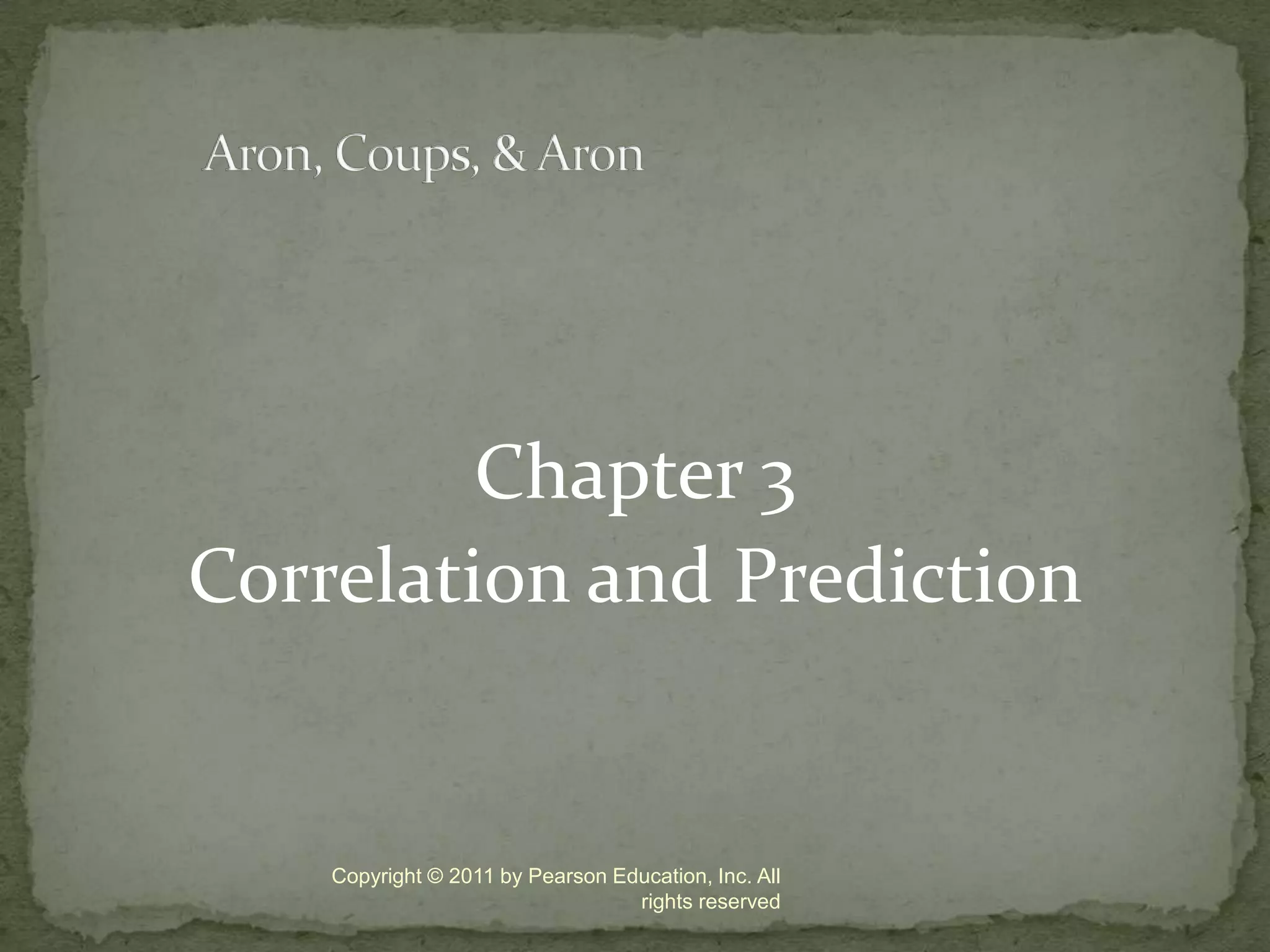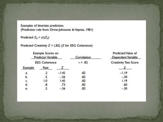 This document discusses correlation and prediction. It defines correlation as describing the relationship between two equal-interval numeric variables. A scatter diagram can be used to examine the pattern, direction, and strength of a correlation by plotting the values of one variable on the x-axis and the other on the y-axis. The correlation coefficient r quantifies the correlation and ranges from -1 to 1, with values farther from 0 indicating a stronger linear correlation. Prediction involves using the correlation between a predictor variable and a criterion variable to estimate values of the criterion variable based on values of the predictor variable.