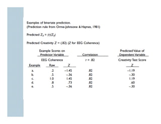 This document discusses correlation and prediction. It defines correlation as a descriptive statistic that describes the relationship between two equal-interval numeric variables. A scatter diagram can be used to graphically depict the relationship and identify if it is linear, curvilinear, or no correlation. The correlation coefficient (r) is a number that indicates the strength and direction of the linear relationship, ranging from -1 to 1. However, a correlation does not necessarily imply causation. Statistical significance testing and longitudinal or experimental studies help determine if correlations reflect a causal relationship.