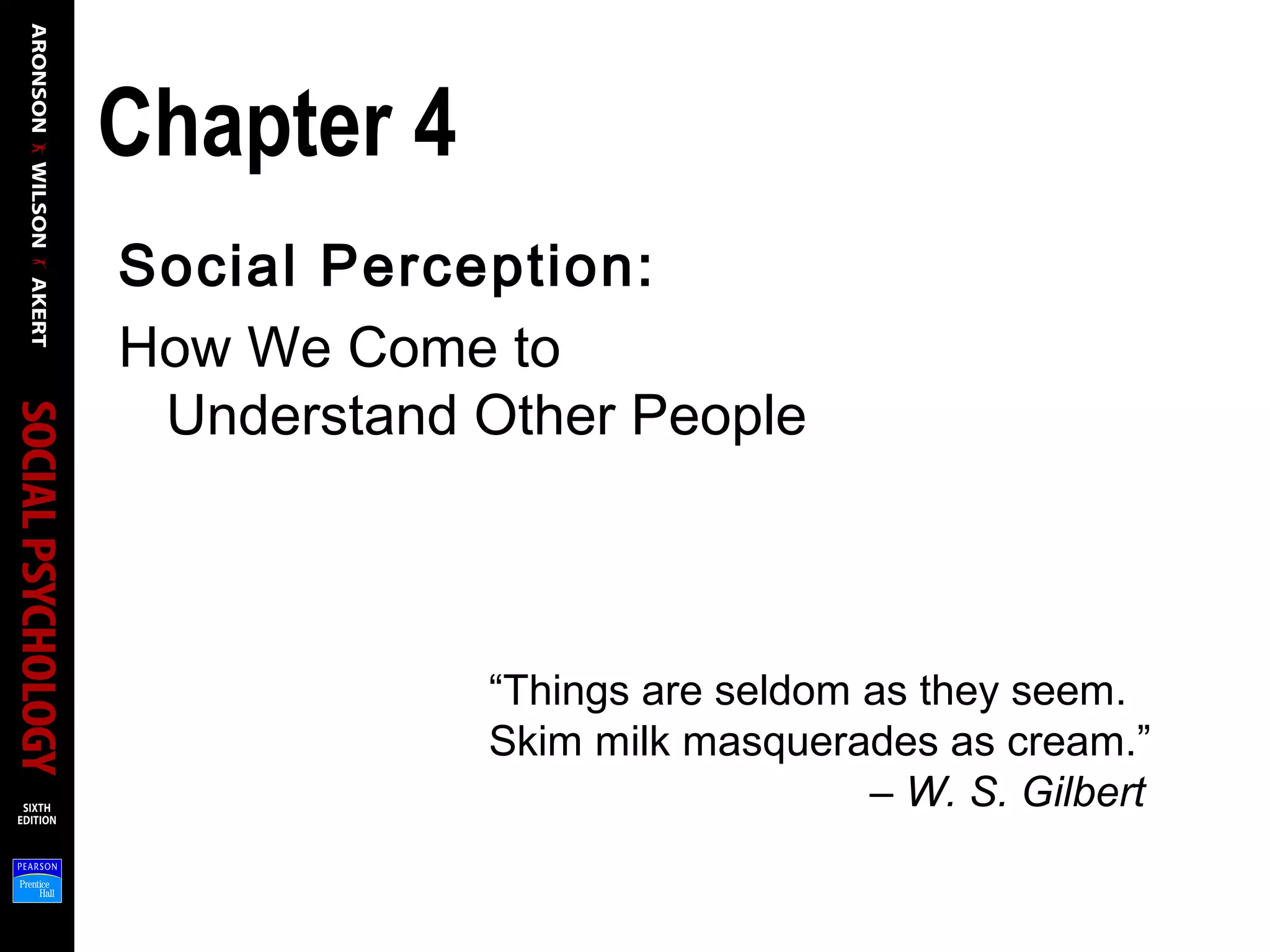This document provides an overview of social perception and how we form impressions of other people based on their observable behavior. It discusses how we rely on social perception to understand people based on what they say, do, and their facial expressions, gestures and tone of voice. It also explains some of the challenges in forming accurate impressions, as we can only observe behavior and not truly know people's inner thoughts and motivations. The document outlines several concepts from social psychology research related to social perception, including nonverbal communication, facial expressions, culture, implicit personality theories, attribution theory, and biases like the correspondence bias.