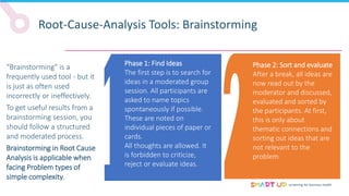 Brainstorming is used to generate ideas in a structured group session, following principles like forbidding criticism and limiting sessions to 60 minutes. The 5 Whys tool asks "why" five times to drill down through problems to their root causes. Affinity diagrams group interrelated causes into categories to identify major causes. Pareto charts identify the most important causes addressing 80% of the problem. Fishbone diagrams show the relationship between effects and multiple potential causes. Other tools covered include interviewing staff, fault trees, and general tips for effective root cause analysis.