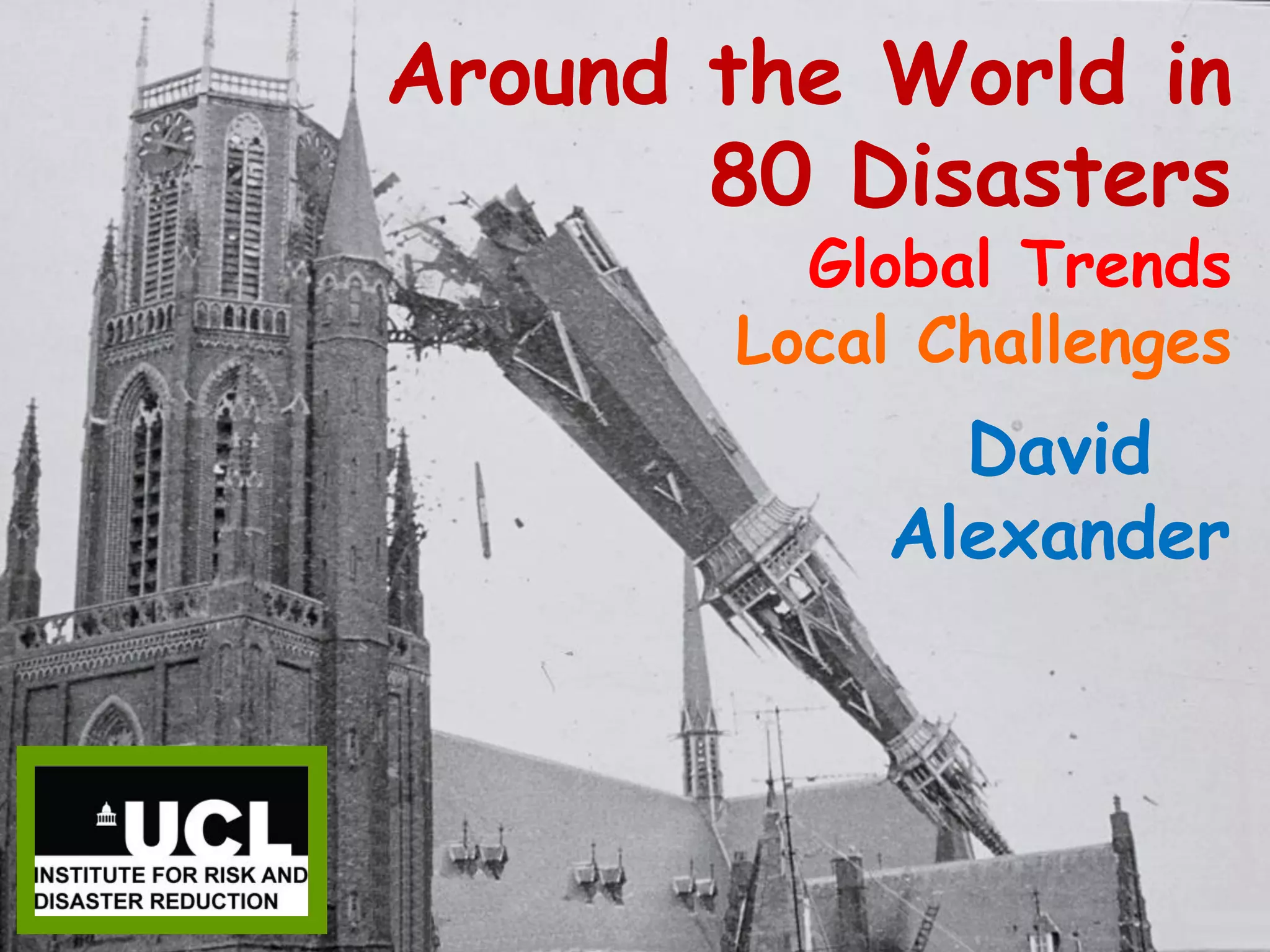 This document summarizes David Alexander's career studying disasters over the past 40 years. It begins with biographical information about Alexander and outlines some of the major theoretical frameworks in disaster studies, including debates around defining and measuring vulnerability. The document then discusses trends in disaster research publications and questions whether progress has been made in disaster risk reduction. It also examines the importance of factors like gender, corruption and resilience. Overall, the document provides a high-level overview of Alexander's work in disaster studies and some of the key issues and debates in the field.