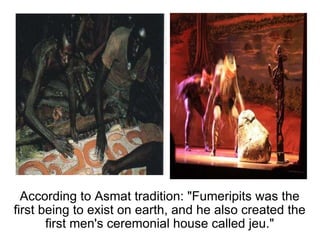 Fumeripits was the first being to exist on earth according to Asmat tradition. He created the first ceremonial house and people but was lonely. To create people, Fumeripits carved figures from trees but they were inanimate. He then made a drum from a hollowed tree and stretched lizard skin over it. When he played the drum, the figures came to life, their limbs separated, and they began to dance - thus creating the first Asmat people from trees.