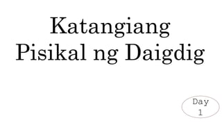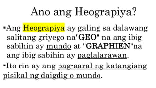 Ang heograpiya ay pag-aaral ng katangiang pisikal ng daigdig, mula sa mga pinagmulan nito hanggang sa mga bahagi tulad ng crust, mantle, at core. Ang mundo ay nahahati sa apat na hemispero at may iba't ibang pangunahing kasangkapan para mailarawan ito tulad ng globo at mapa. Tinalakay din ang mga pinakamataas na bundok at pinakamalalim na bahagi ng mga karagatan sa mundo.