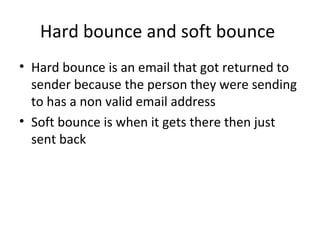 The document defines and describes several key computer networking terms: hard bounces occur when an email is returned due to an invalid address, while soft bounces are emails returned after delivery; computer spam involves mass emailing unsolicited messages to promote products; intranets run faster than the internet but within a single environment; POP is an application layer protocol for email retrieval; phishing aims to steal user information through deception; encryption scrambles messages during transmission and decryption unscrambles them; netiquette outlines proper online conduct; and routers connect computers to the wider internet.