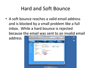 The document discusses key concepts related to email and the internet including soft and hard bounces caused by full inboxes or invalid addresses, spam as unwanted junk mail, the differences between the internet and intranets, POP protocol for email clients and servers, phishing to illegally obtain personal information, encryption to securely send emails, netiquette rules for polite online behavior, and routers forwarding information on the internet.