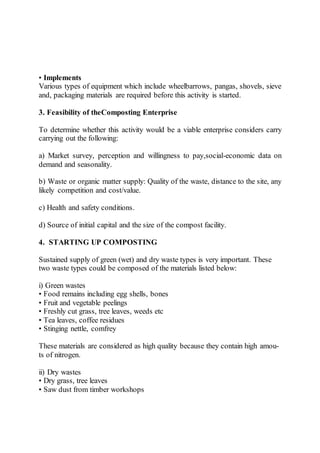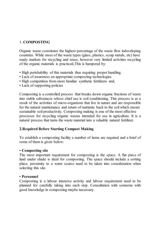 The document discusses various methods for composting organic waste materials, including windrow composting, aerated static pile composting, box composting, pit composting, and vermicomposting. Windrow composting is one of the most commonly used methods as it is inexpensive, uses local equipment, and can be operated outdoors. The process involves layering green and brown organic materials in long piles called windrows and turning the piles regularly to introduce oxygen. Other methods like aerated static pile and box composting control environmental factors better but require more resources. Pit composting is suitable for institutions and breaks down waste anaerobically over 6-10 months. Vermicomposting